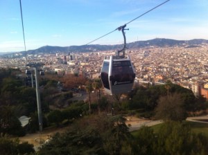 We took the Metro to the base of Monjueic, then took a gondola ride to the very top where the original castle/fortress still stands. The view from the top is beautiful – the city spread out below, Mt. Tibidabo (home of a monastery we have yet to visit) in the distance, the Mediterranean in the east – very cool. The mountain is also home to many museums, park areas, and other exhibitions and festivals during the year – we will have to come back for all of that. The castle grounds were very well-maintained, with lovely walking paths, a big internal, walled plaza, some remaining battlements (big cannons), etc. We stopped to watch a woman taking archery lessons on a huge strip of grass lining one side of a castle wall…it so happened that the wall was where the shooting squad had operated centuries before. Ack!