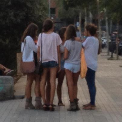 I am digressing but it’s a must. It is a pretty humorous sight at about 5pm each day – after all the kids are out of school and should be doing homework (sigh), that there are a couple of locations in particular near where we live that are magnets for the 14 – 18 year old set to congregate and do their version of Hanging Out. And in this case, it’s both literal and figurative. The current Spanish teen girl uniform is: