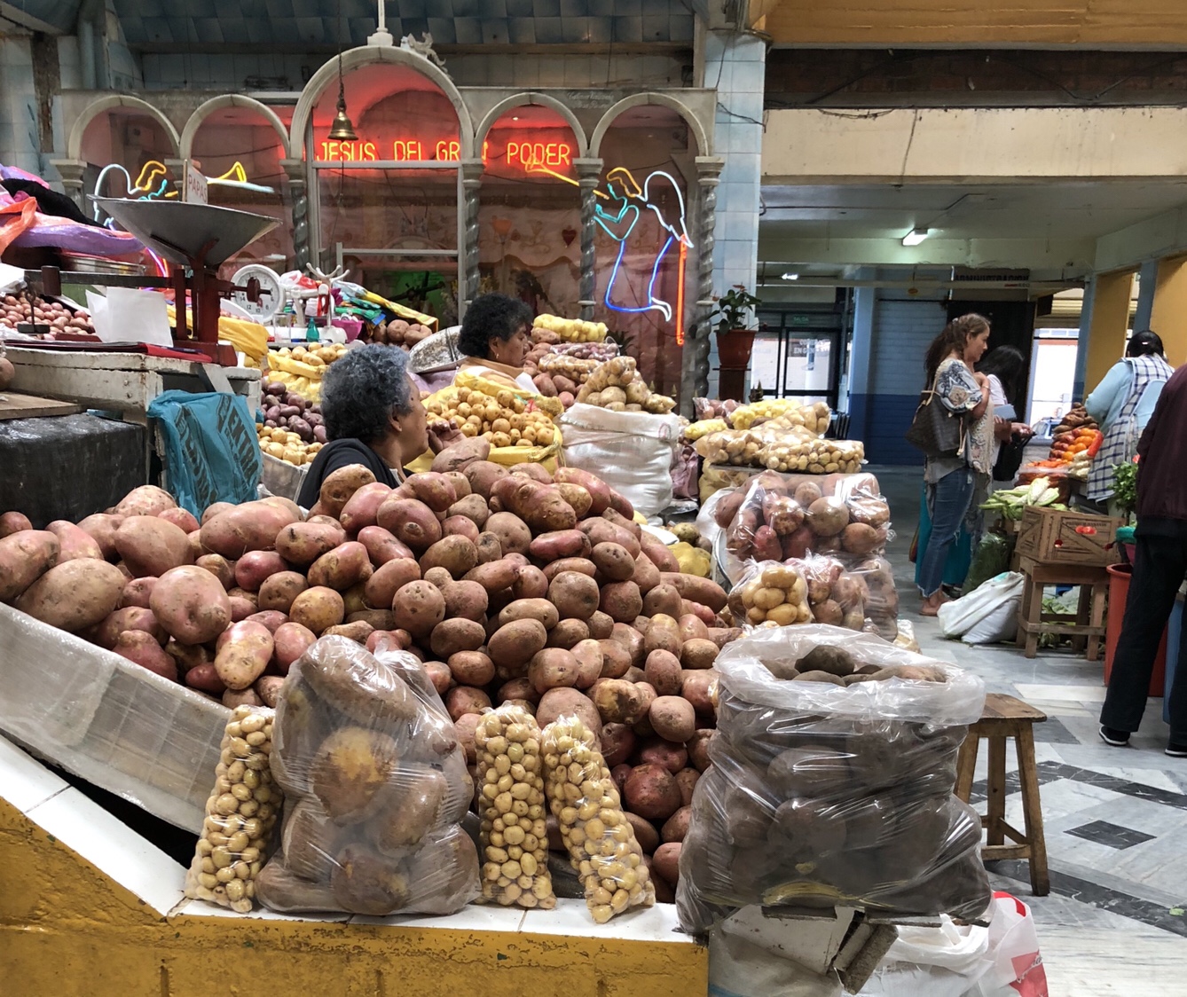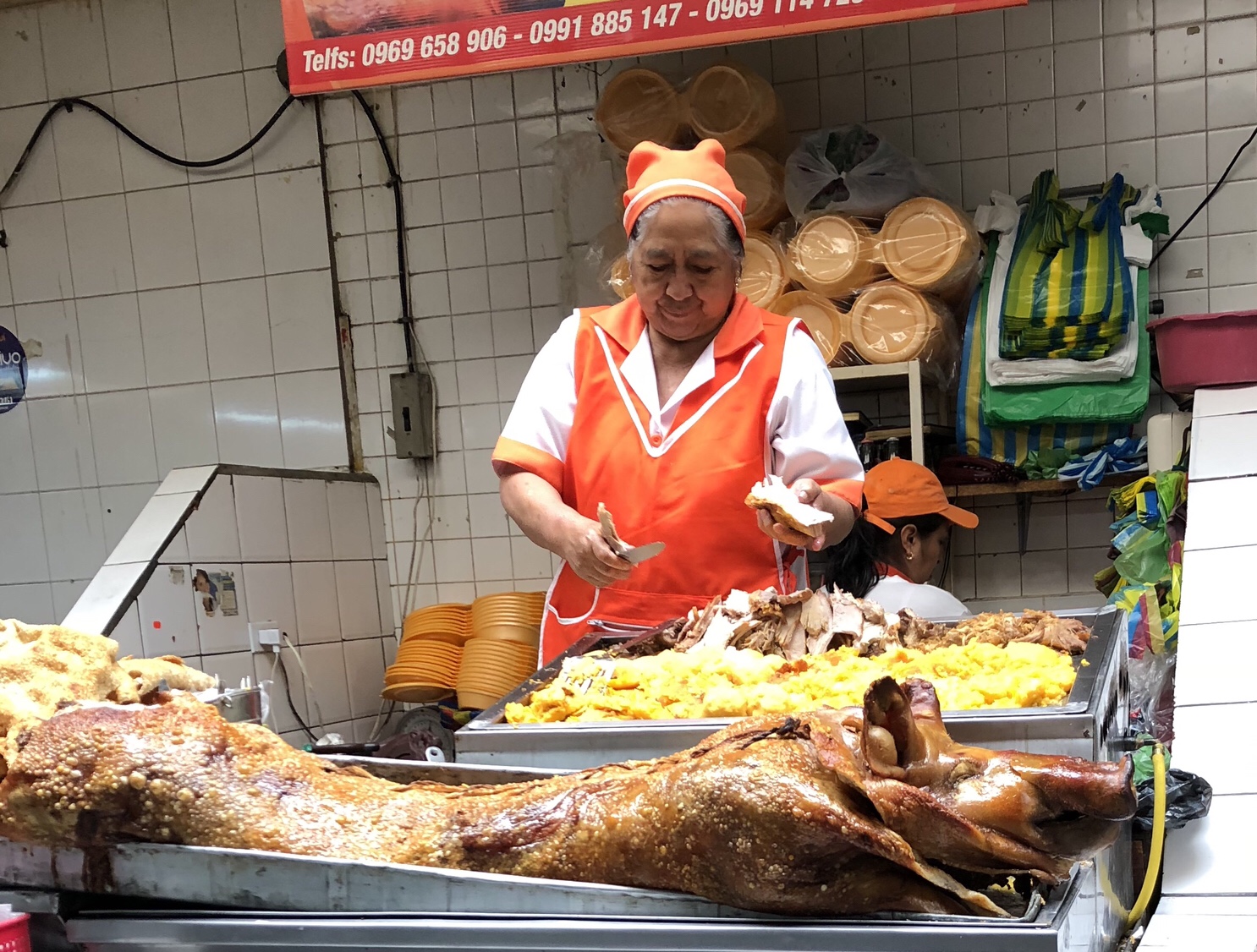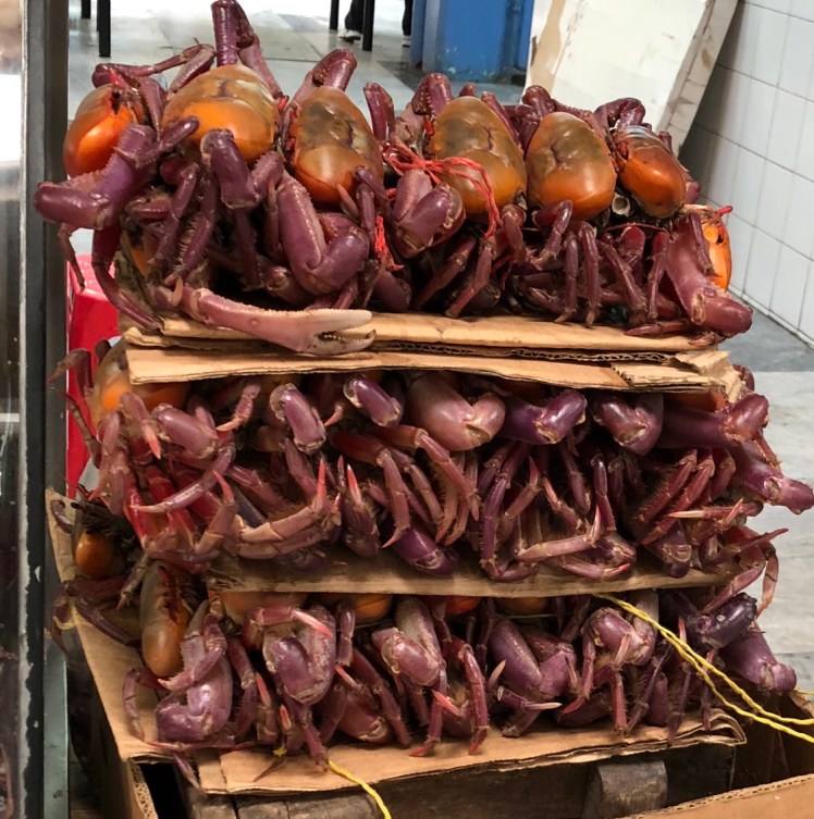 Our first stop was at the mercado (market) closest to the apartment where we were staying. It turned out to be the neighborhood market where locals did most of their shopping for amazing produce, seafood and meats. It also is known for being the best market to get typical Ecuadorian breakfast made of pork, potatoes and spices, called hornado. We found out that there are more than 200 different types of potatoes grown and cooked in Ecuador as well. Obviously it is a staple food and shows up in many native dishes. Interestingly, while the coast is where fish are caught in abundance you can get amazing fresh seafood of all kinds in landlocked Quito. The main roads in Ecuador are actually really good – you can get from the coast to Quito in four hours…except on holidays when everyone heads to and from the beach! We saw some very interesting, colorful, and very much still alive crabs ready to be purchased. Luis did take us to a restaurant for lunch that had terrific ceviche and calamari.