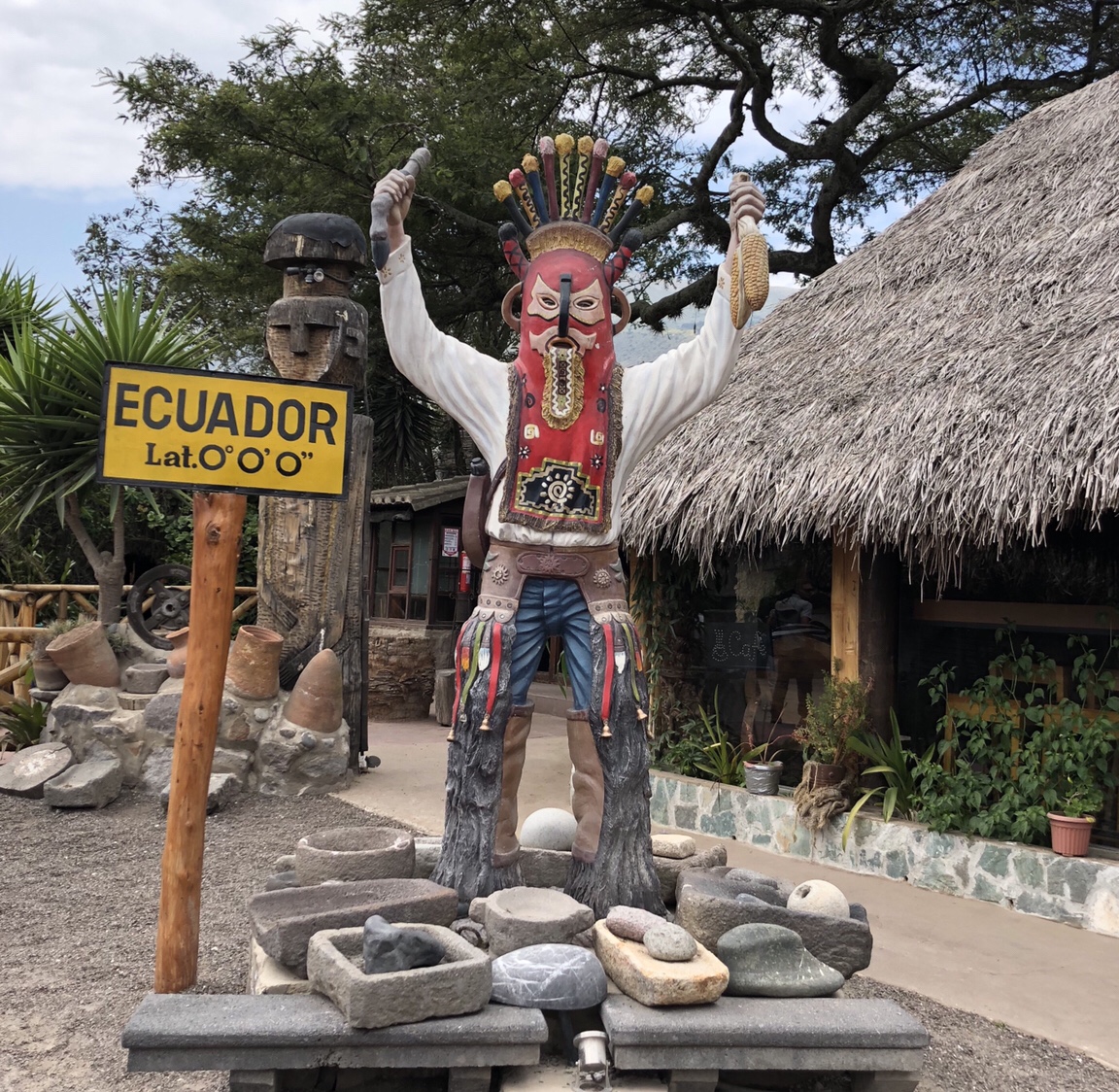 This is the Ecuadorian emissary that greeted us as we entered Museo de Sitio Intinan that is really located at “ground zero” latitude! We joined a small group led by an English-speaking young man who took us through the exhibits that helped us understand more about indigenous cultures in Ecuador. We learned first about an Amazon tribe that to this day still practices creating shrunken heads. Fortunately, this tribe is deep in the Amazon – not on our current itinerary.