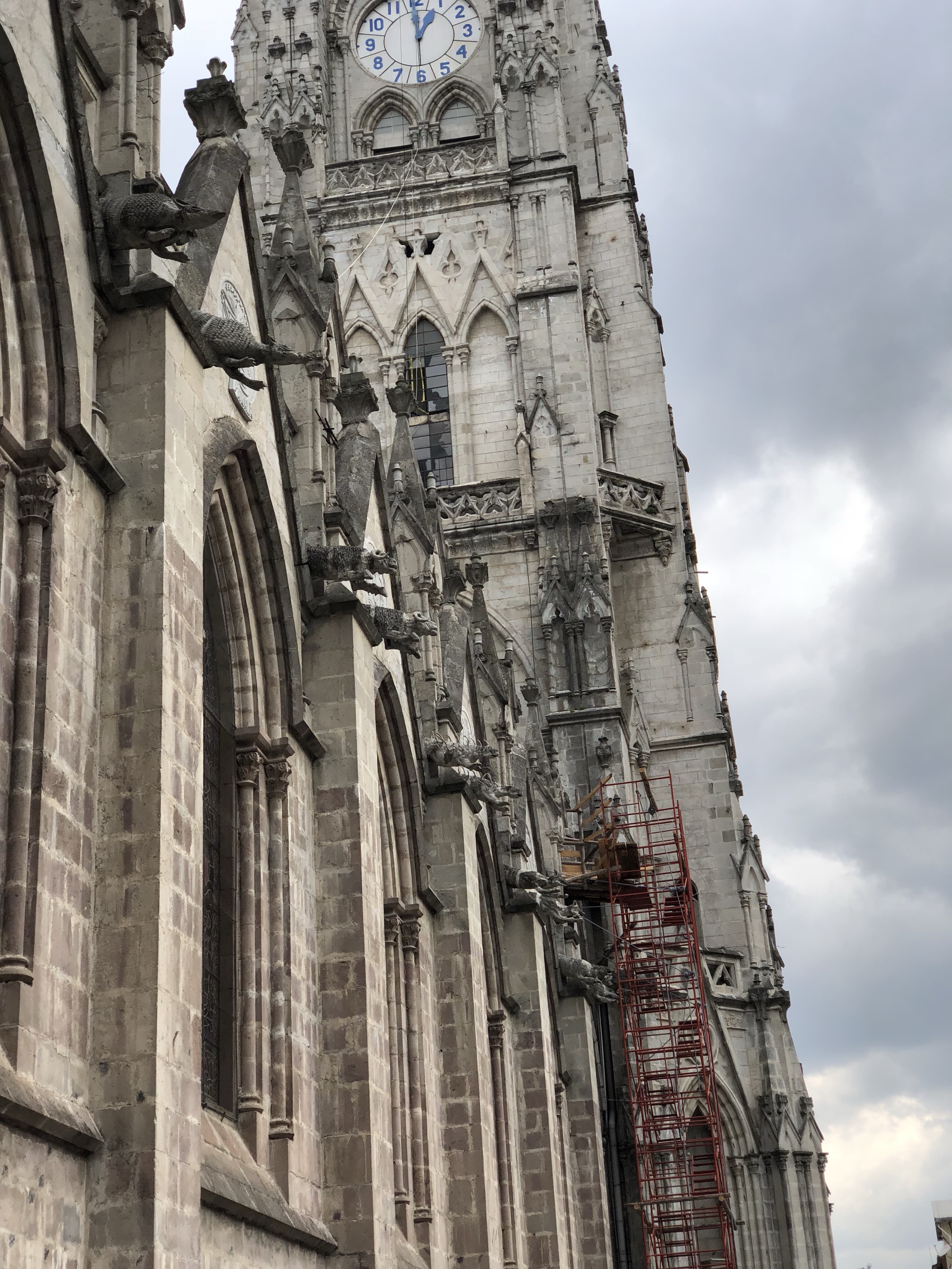 Then we were off to see the old center of the city. Luis regaled us with some of the history of the country, we walked through some of the wide variety of churches that populate center city, and enjoyed lots of people watching as today is part of the festive lead up to their version of Ash Wednesday. We did stop at the main cathedral just outside the old city. This one had the most unusual gargoyles in the shape of animals native to Ecuador and to the Galapagos islands.