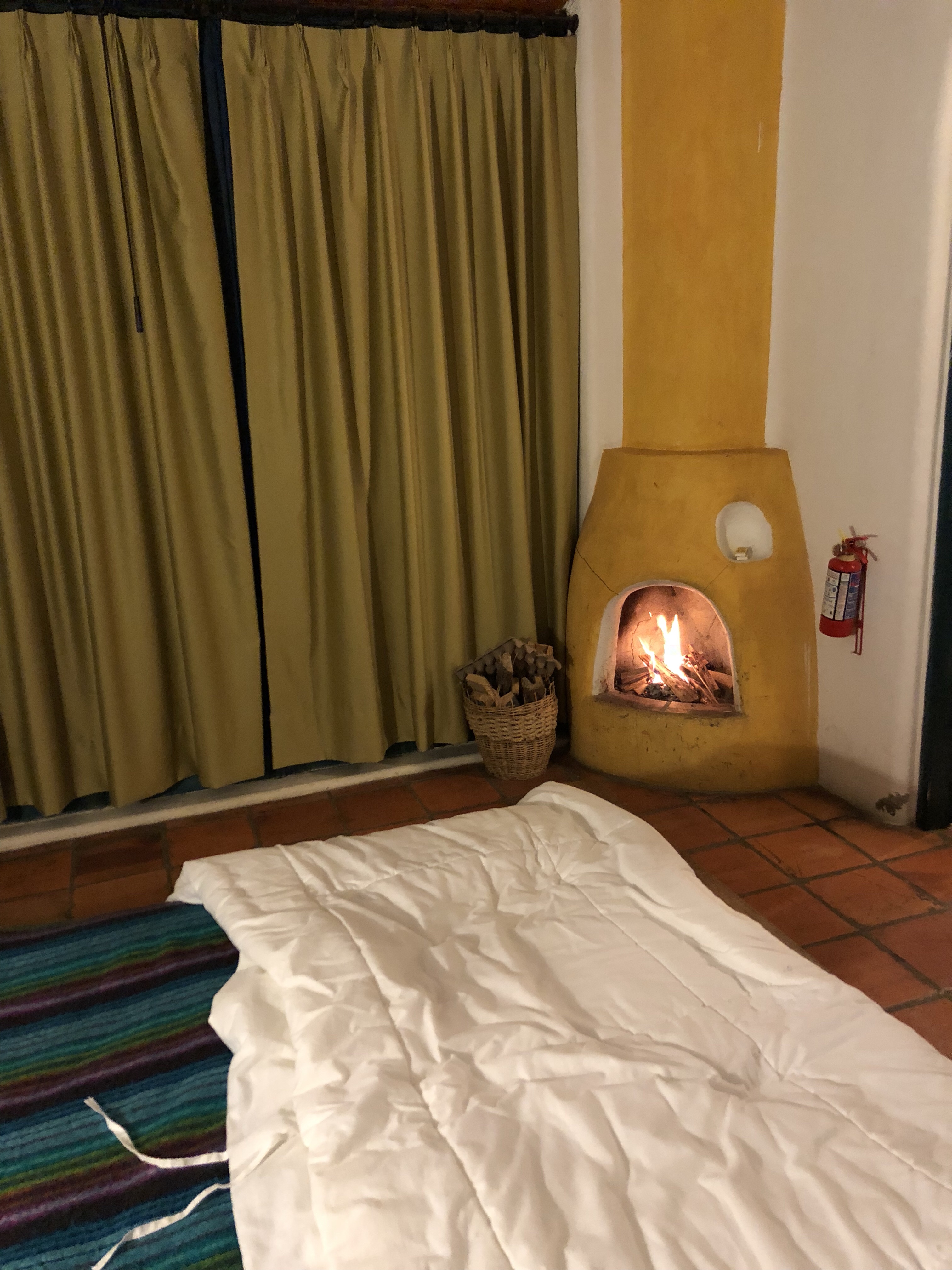 There are accommodations for hikers who are on the Quilotoa Loop – dormitory style for budget digs ($19/night or so), and for us older folks there are a couple of private cabanas with their own bathroom, patio, and wood-burning fireplace…at the extravagant rate of $40/night! Mind you, this includes a full breakfast and three-course dinner each day…I will let you know if the food passes muster. The grounds and cabanas are spotless and there is even a hot pool and dry sauna that can be used in the couple of hours before dinner. There are a few common areas to sit and relax, a nice dining space where you can get coffee and tea at all day, and even a hammock to chill in. So far we are thrilled.