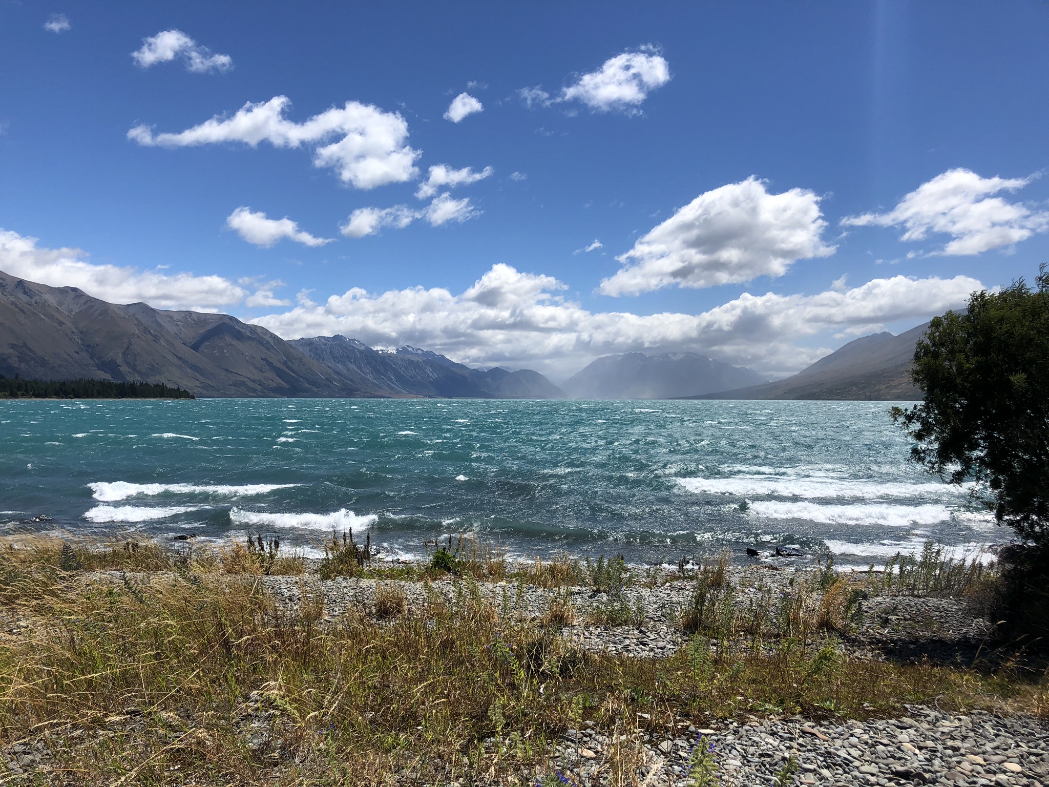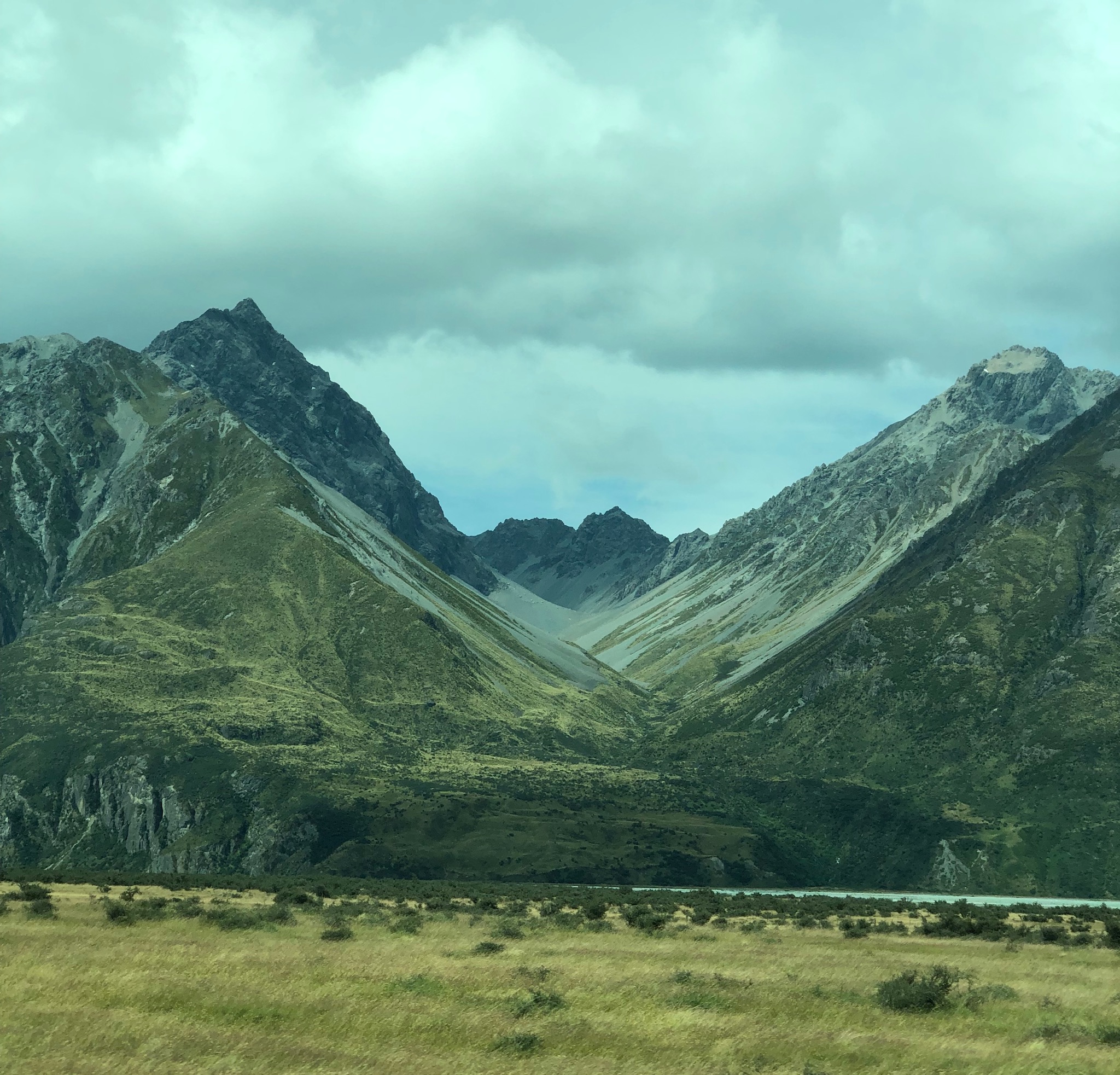 The first thing I noticed when landing and starting our time on the South Island was how very different the landscape is from its counterpart up north. The North Island definitely felt very tropical – a lot like Hawaii in its vegetation, humidity, and overall flat-to-rolling hills terrain. We found the South Island to be a patchwork of arid, drier farmscapes, more sheep than people (yep), and later, dramatic peaks, beautiful waterfalls and lush, deep canyons that actually reminded me of the Andes in Ecuador. We got to experience all of these settings on our Alps to Ocean bike ride – the subject of my next entry…