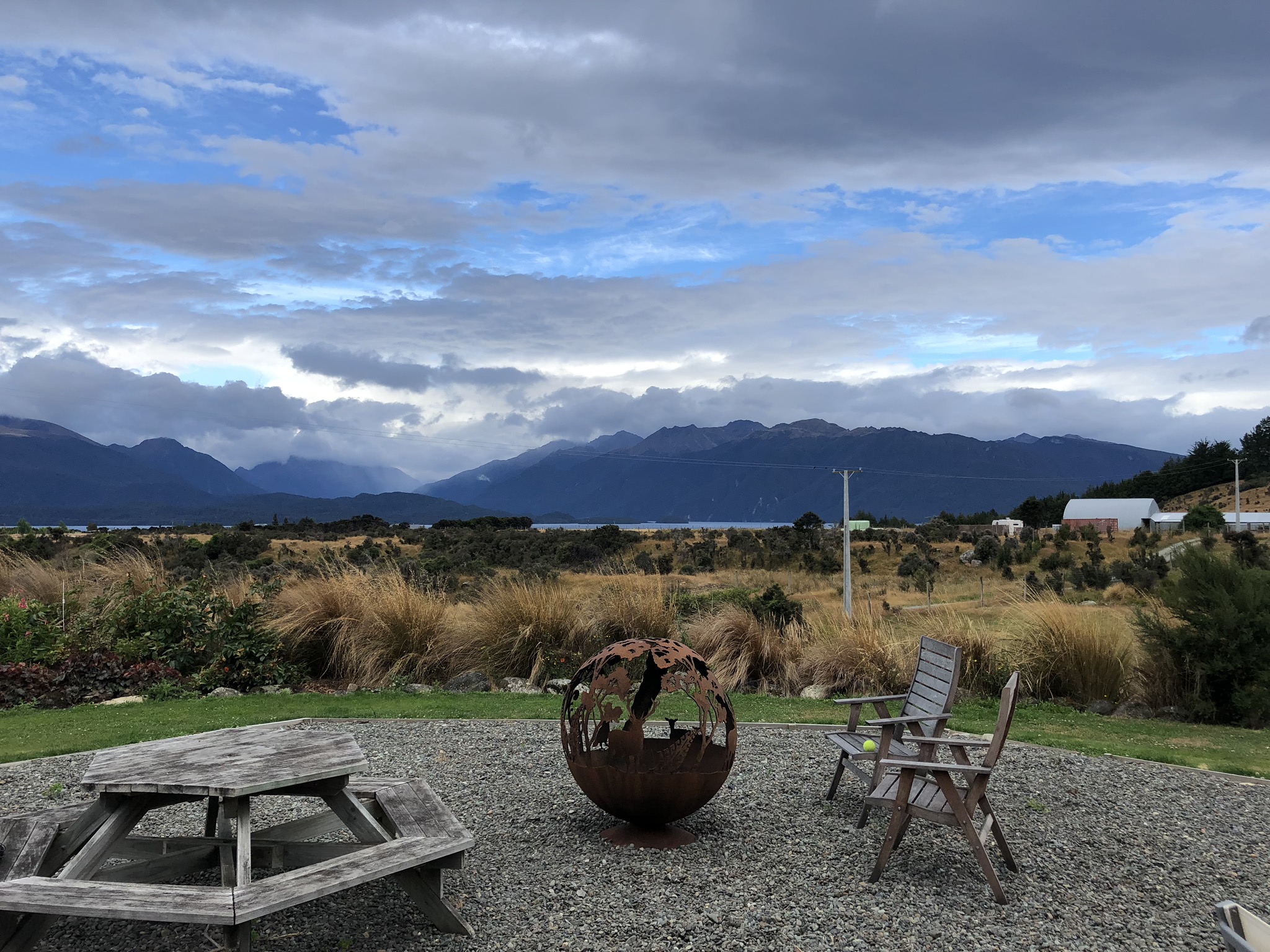We’d been told that we could not miss visiting Milford Sound if we got to the South Island, and I absolutely understand why now. We booked a day-long kayaking trip that would take us on the sound, and what made sense was to drive to and stay in the small town of Te Anau – known as the gateway to the sound area. We lucked out in our choice of an awesome bed and breakfast (South Fiord Bed And Breakfast) run by a lovely couple, John and Linda. John is an emergency rescue guy (he goes out on the helicopters to rescue hikers and others who get themselves in a pickle), and Linda runs the B and B, tends to the farm animals (sheep, chickens, etc), nurtures the garden, and bakes like a fiend! Our room looked out on their substantive acreage and Lake Te Anau…we could watch the sunset from our bedroom.