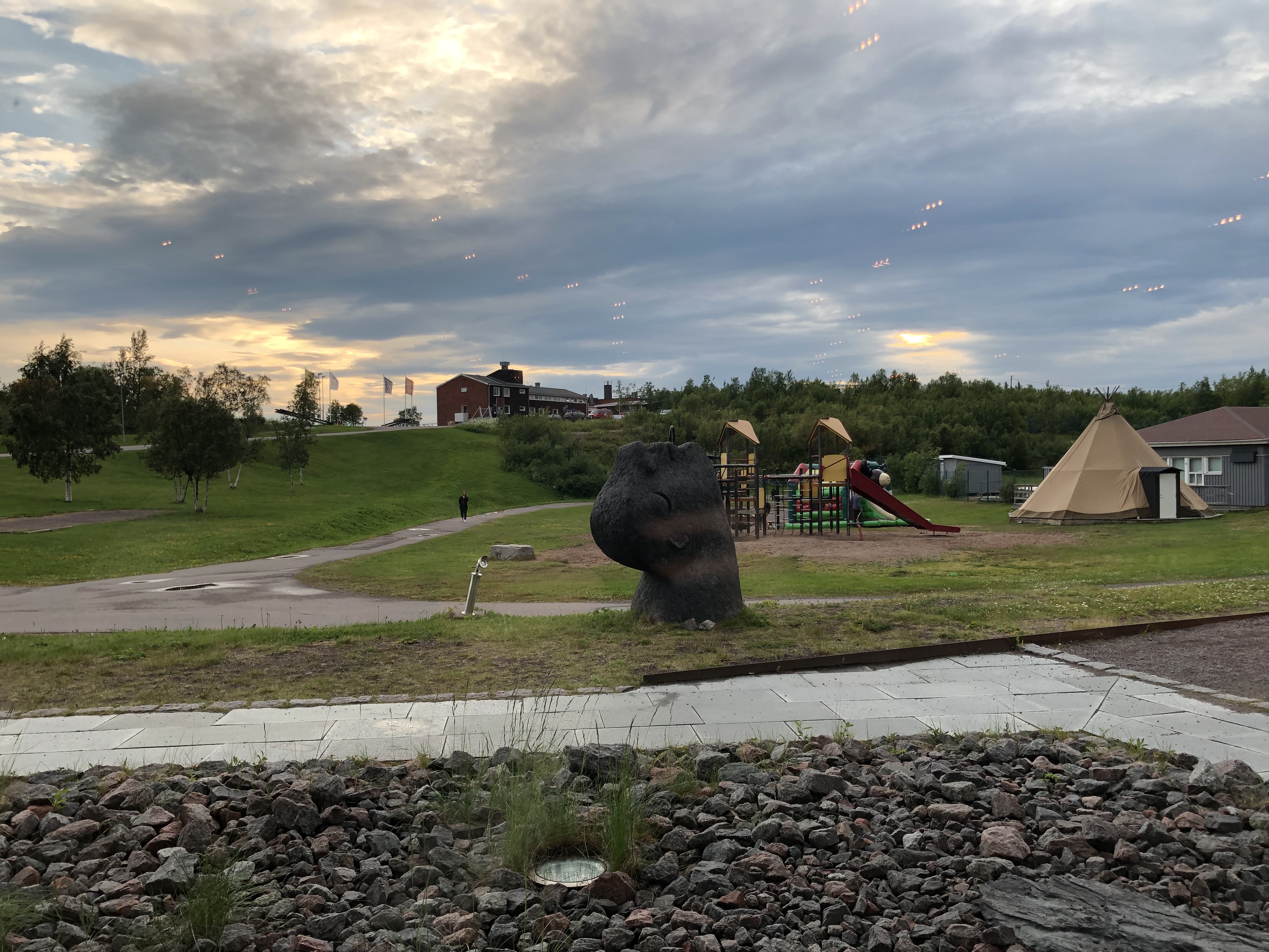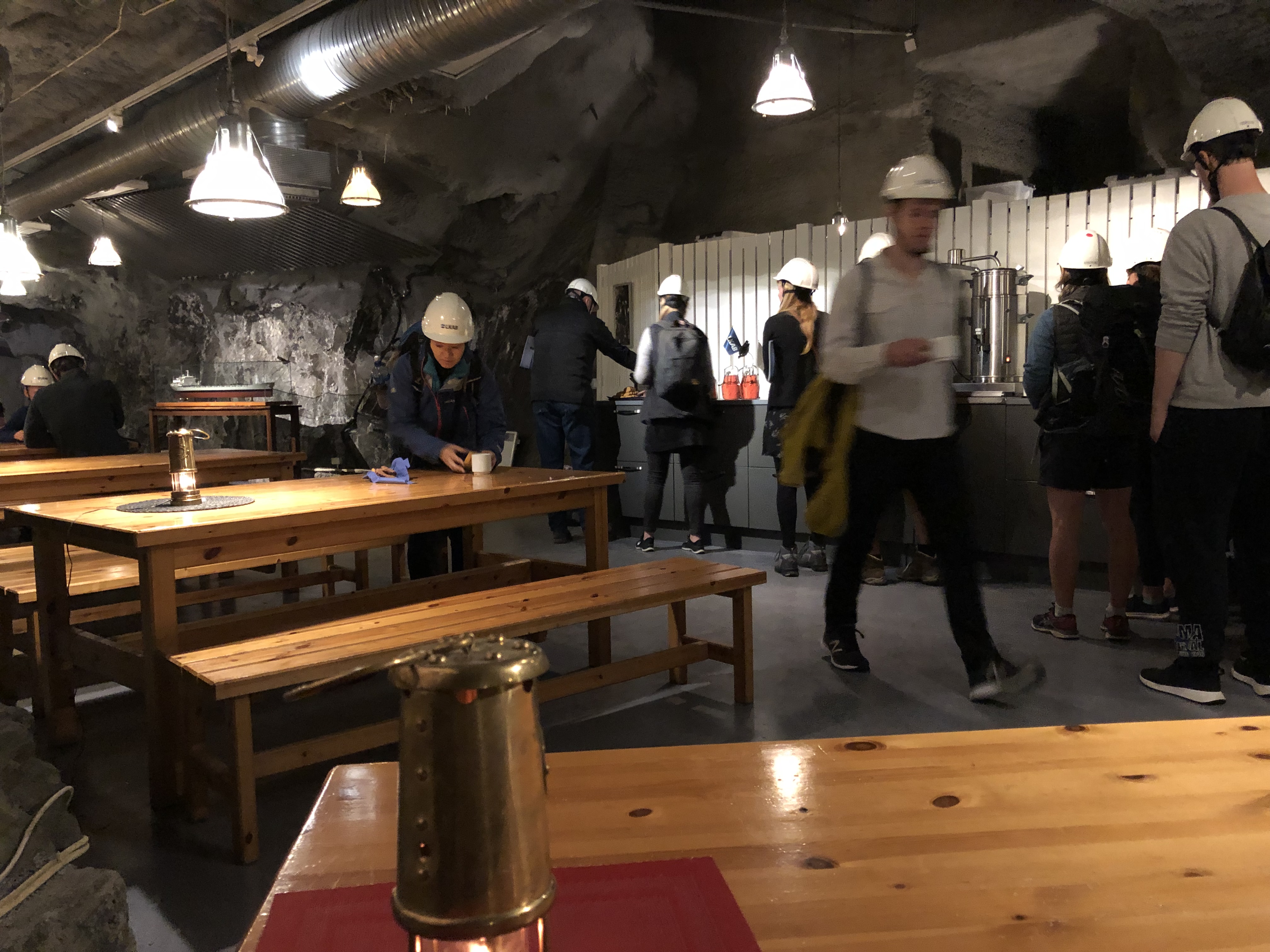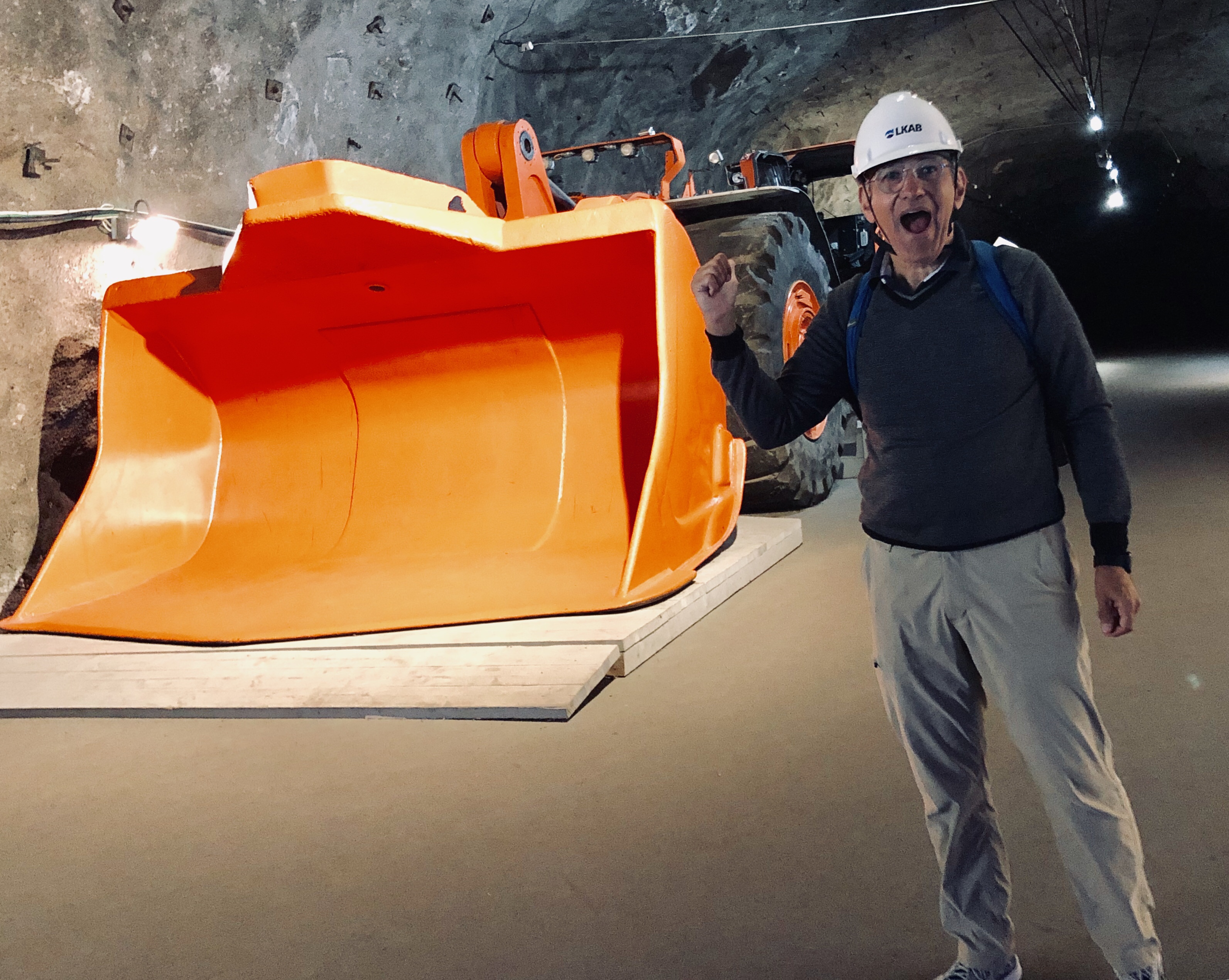 The tour of the mine was mind-blowing. There is literally a city underground – people work a 24/7 mining operation – fewer underground as much of the process underground is mechanized, most in control centers above ground. We drove into the mine in a bus with at least fifty people and a guide, on excavated and paved roads. We were guided on a walking tour inside a cavernous and modern display area and learned details of how the mining is actually done. It was a two hour lesson in engineering! Fresh air is circulated and temperature underground is kept very comfortably cool, and there is even a café were we got coffee and snacks. The LKAB company has done an impressive PR job and obviously works hard to keep its employees and the town of Kiruna happy as it spreads its operations. The company is actually now owned by the Swedish government so it is well-resourced and highly attentive to environmental impacts. In other places we visited in the northern part of Sweden we saw some of the plants where the iron ore “pellets” are shipped for conversion to various steel products, and where some of the by-products of the extraction process are used for other things.
