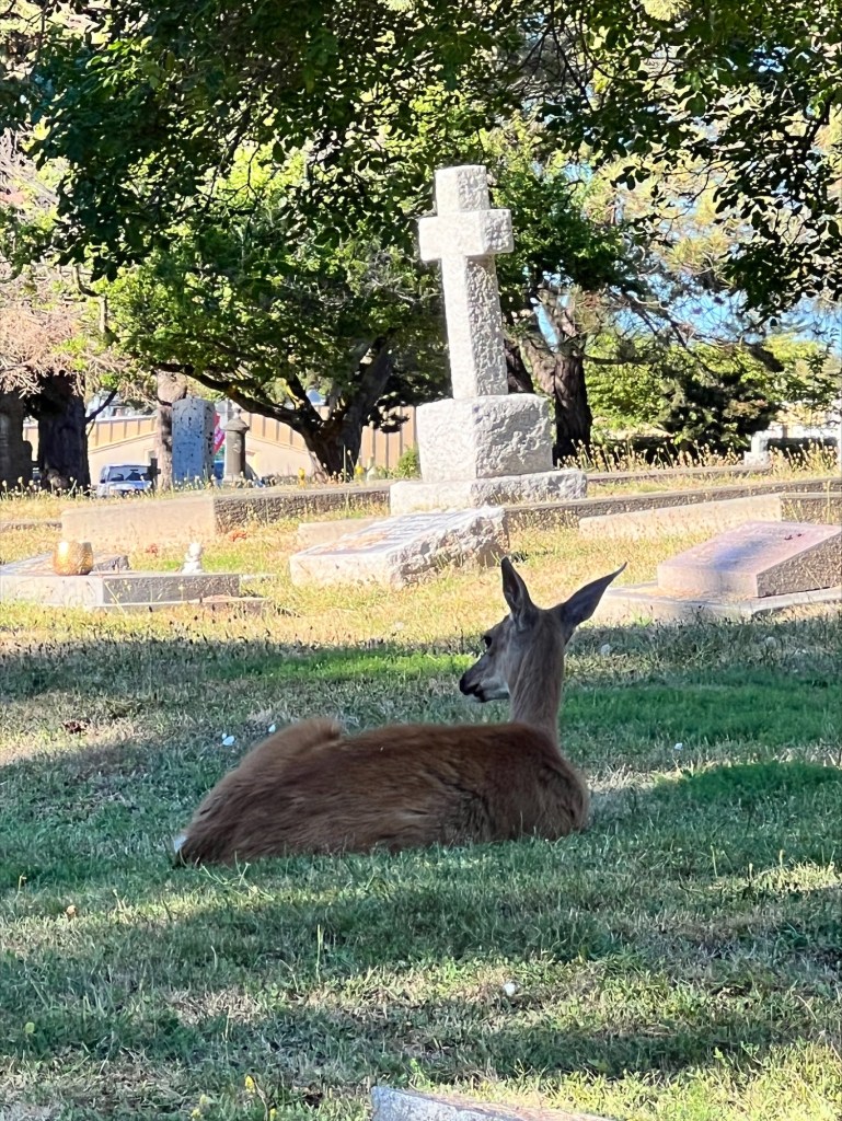 One touching thing we experienced in the neighborhood we stayed in was the presence of beautiful deer who found peaceful respite in the shade of trees that graced the local cemetery. We walked the lovely pathways through this centuries old burial ground that sits on a bluff overlooking the Strait of Juan de Fuca, and found these lovely creatures keeping the souls there company.