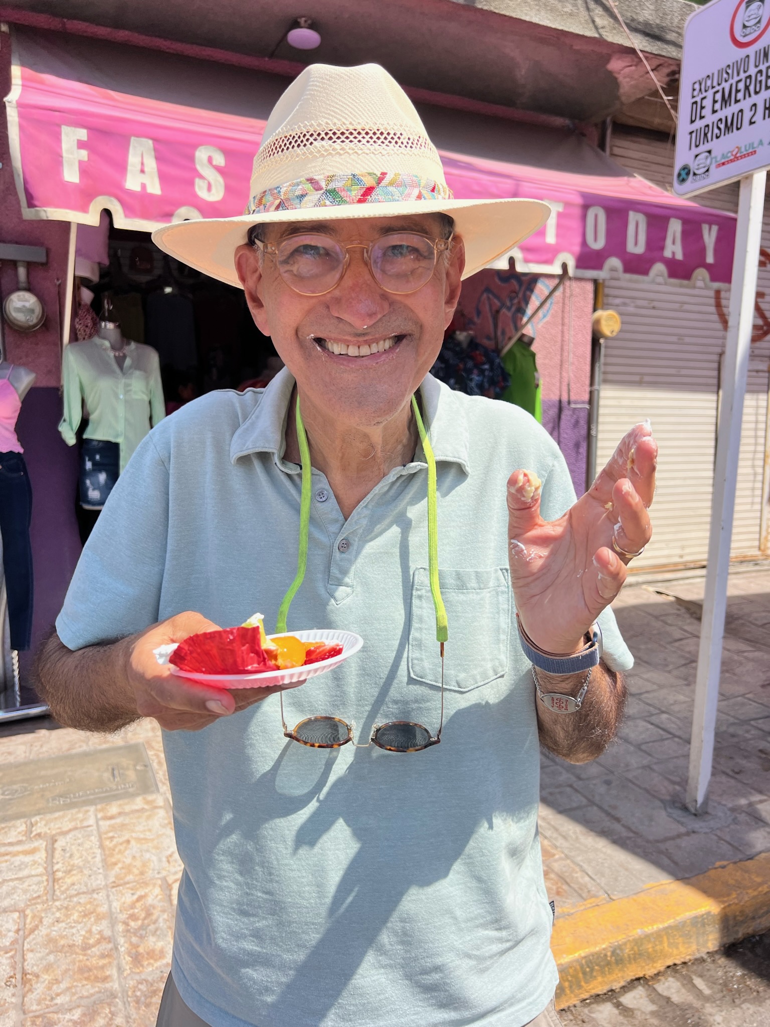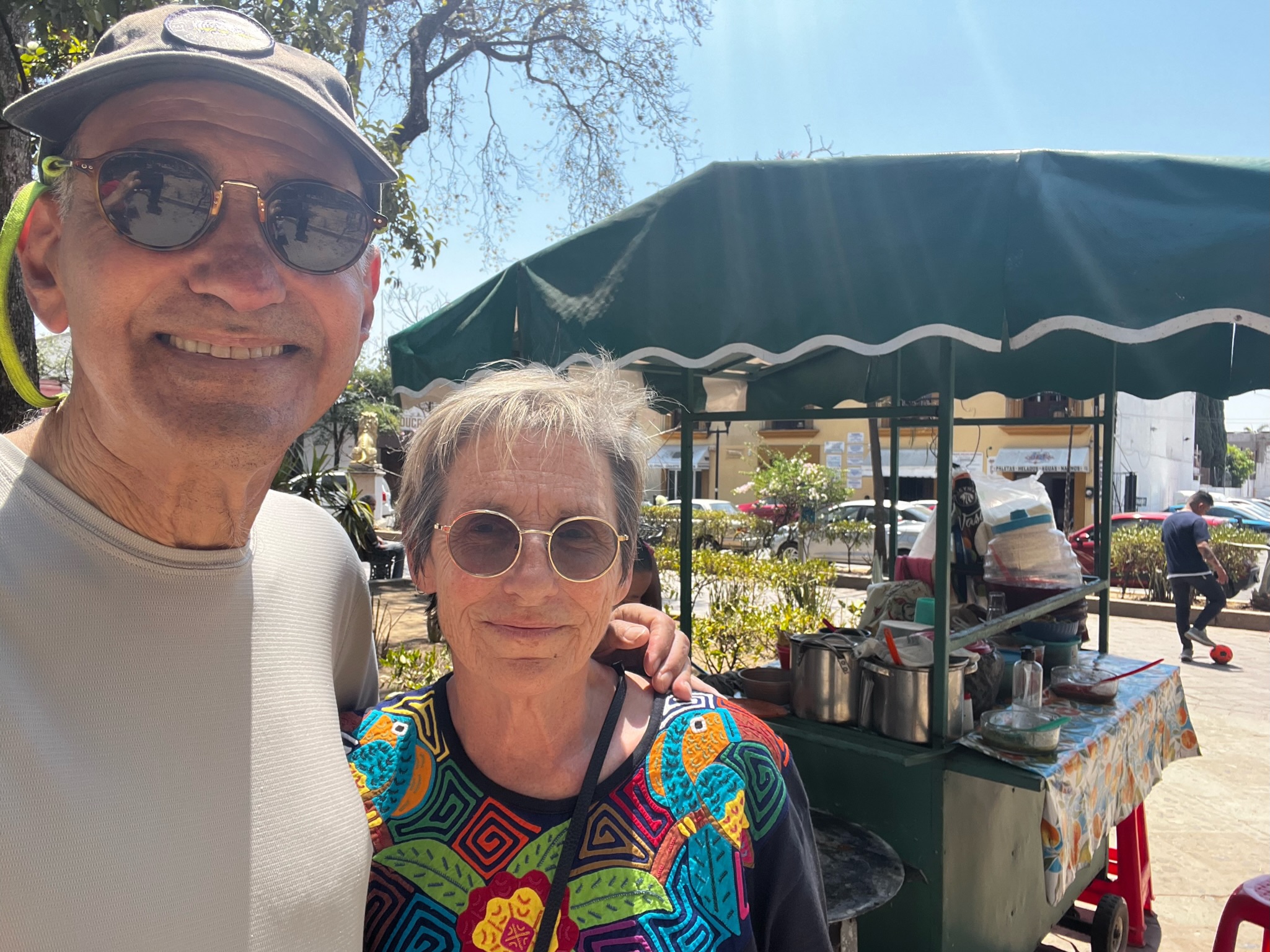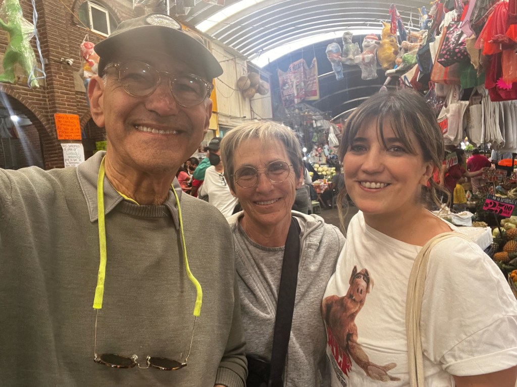 Another definite highlight of our Mexico City stop was a street food tour that had been recommended by our daughter, Ruthie and her husband, Simon. We were lucky to even get the very same guide – a vivacious (and loquacious) woman nicknamed “Panda”. While the idea of “street food” might not be for the overly cautious, in this case Panda took us through one of the city’s many well-established daily markets (called Jamaica) that also includes an incredible flower market. Panda and her associates know the regular vendors very well and the goal is to bring tourist dollars directly to the local purveyors to keep them in business. We got to try all sorts of local delicacies – from meat-filled tacos to spicy corn to yummy sweet cakes. It was a good thing we’d been warned not to eat breakfast!