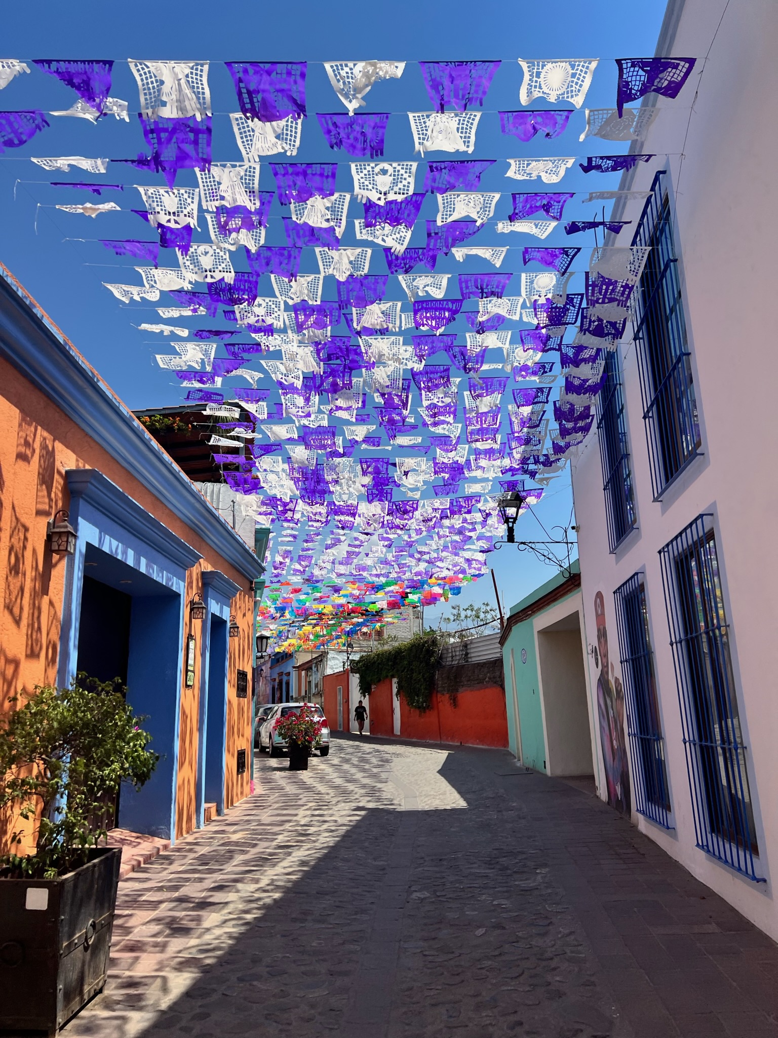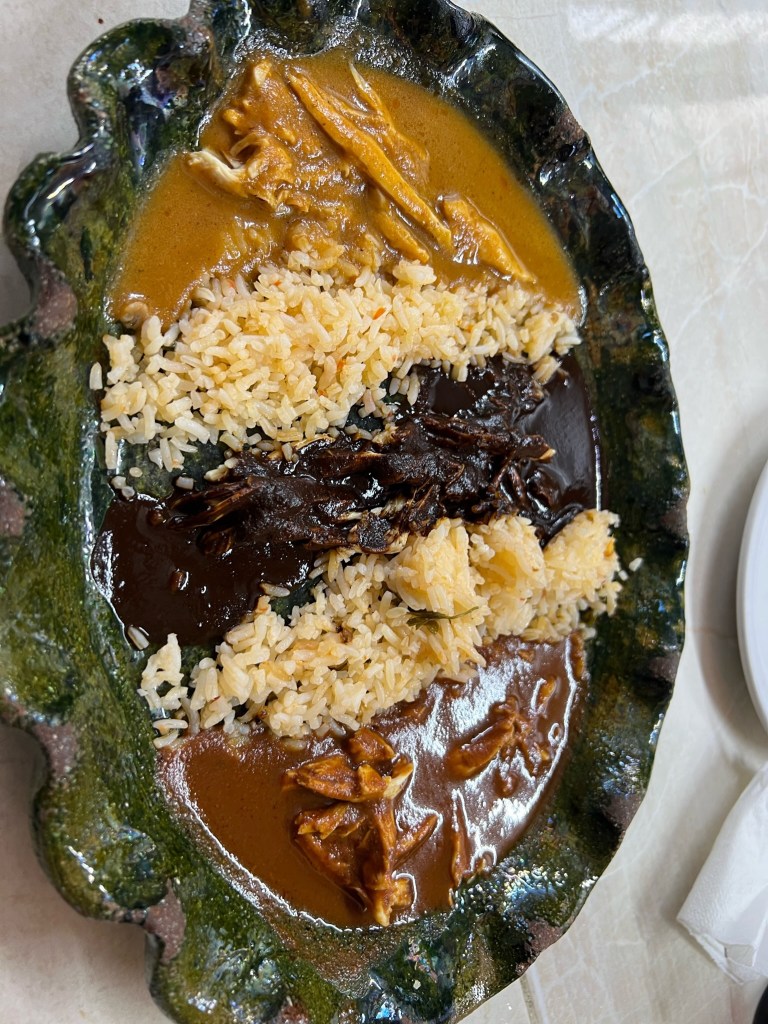 The final leg of our trip was in the southern part of Mexico – the city of Oaxaca (wah-HA-kah). We’d both heard of Oaxaca and had been told that it is famous for folk art and mole. Both proved to be true, and then some. In great juxtaposition to the big city we’d just been to, Oaxaca is best described as a substantial city that has retained a very close tie to its historical traditions in everyday life. Unlike in Monterrey and Mexico City, relatively few people we encountered here spoke English…and most of the tourists were from other parts of Mexico! While there were clearly signs of catering to tourism, with many outstanding restaurants and art galleries, the city itself has held on to its original layout built around centuries-old cathedrals and plazas. Most buildings remain low rise and simple with many having been renovated inside but retaining colorful cement on the outside.