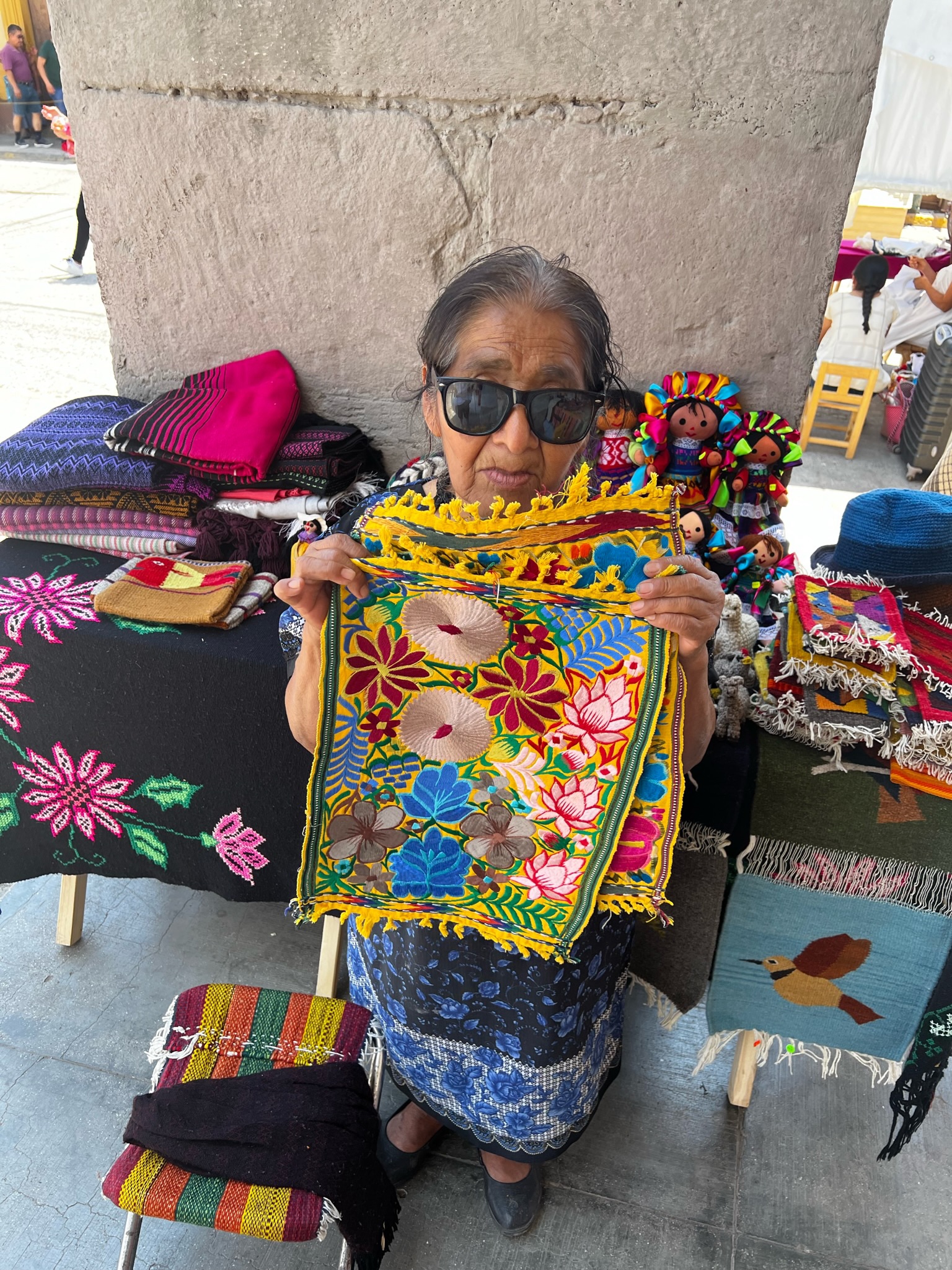 Having been told that the most incredible outdoor market in the state of Oaxaca only takes place about 45 minutes outside the city – and only on Sundays – we had to go. We took a taxi to the Tlacolula Market and were not disappointed. This market stretched as far as the eye could see in all directions, and there really wasn’t anything you could not find there. Growers and artisans gather from all over the area and this is where many families come to do their weekly marketing. Andrew did find a scrumptious fruit tart he couldn’t resist and we came away with a colorful rug/table runner for us and some handmade goodies for kids and grandkids. The ride home was an experience – we took a local bus filled to the standing brim with locals, tourists and live chickens!