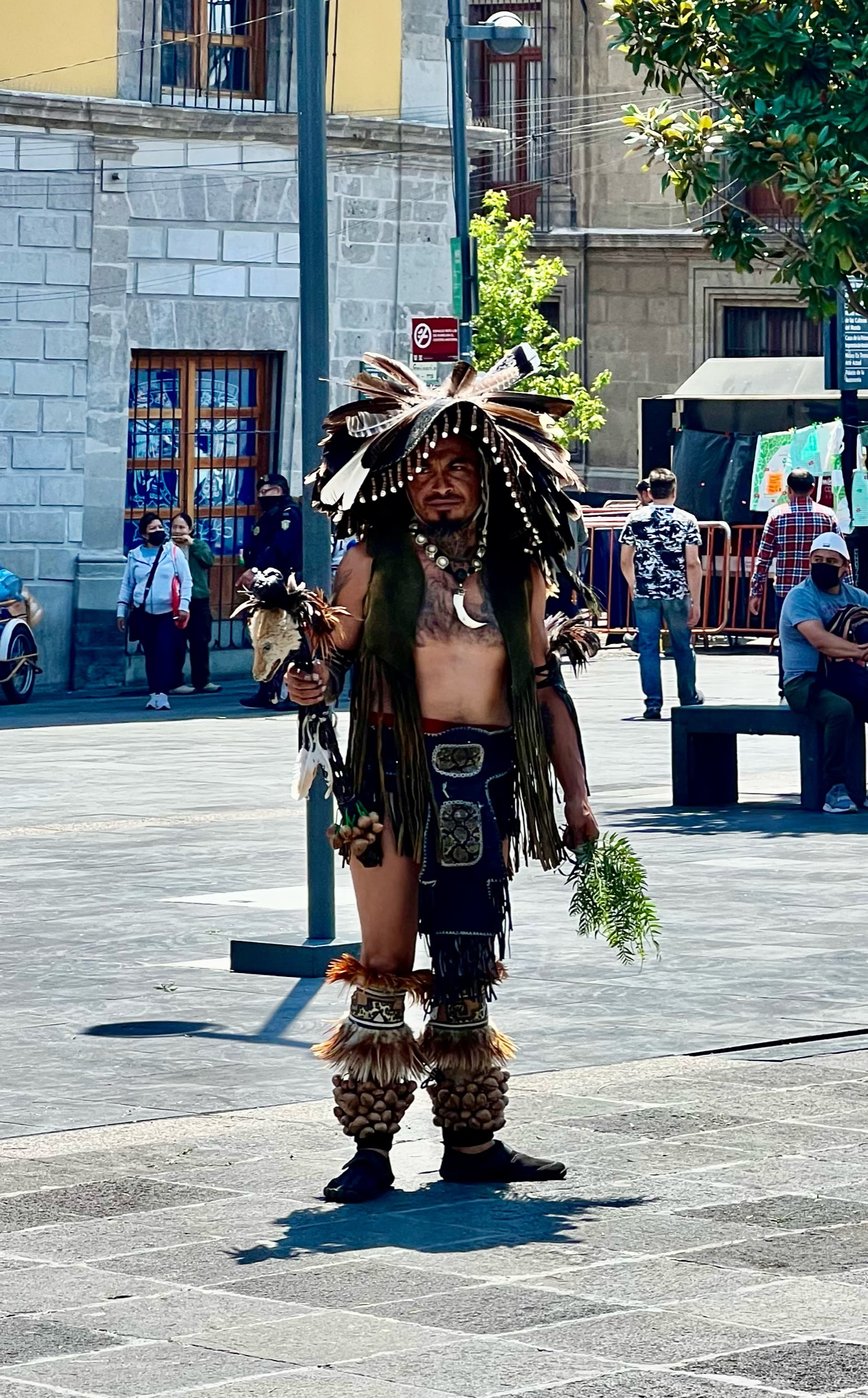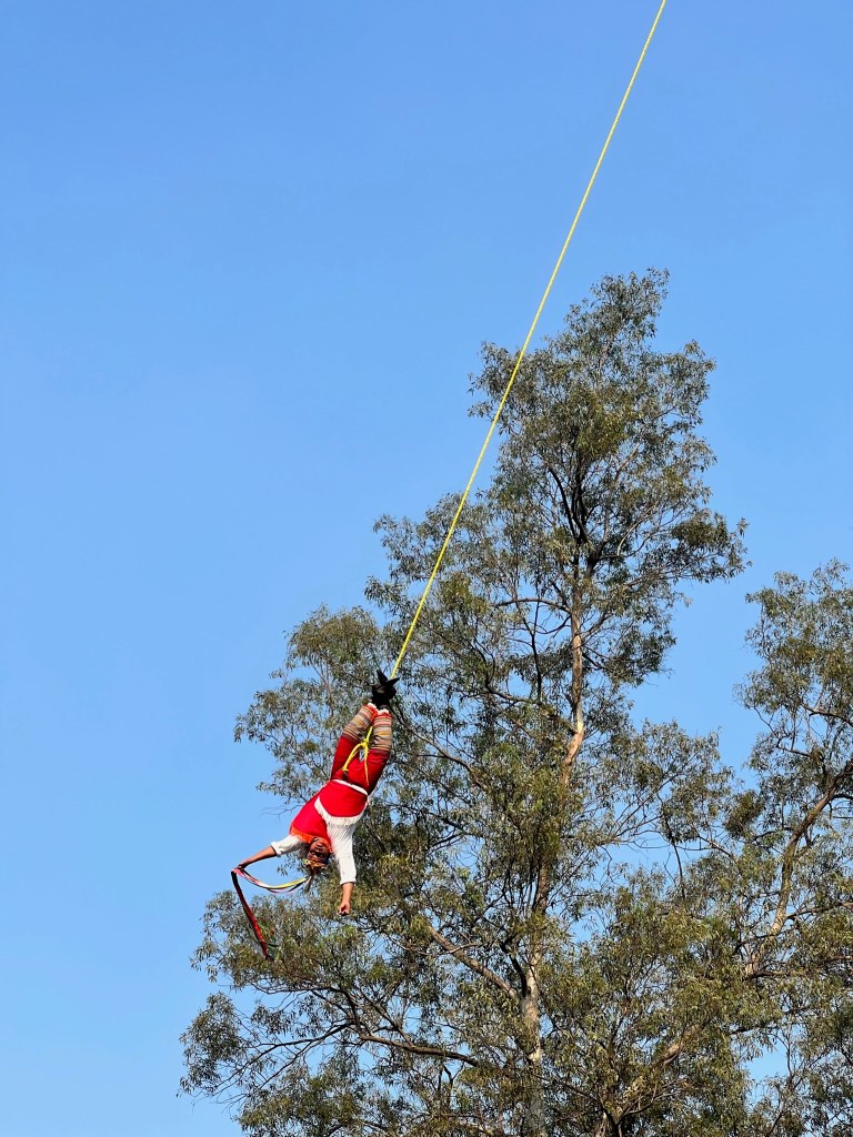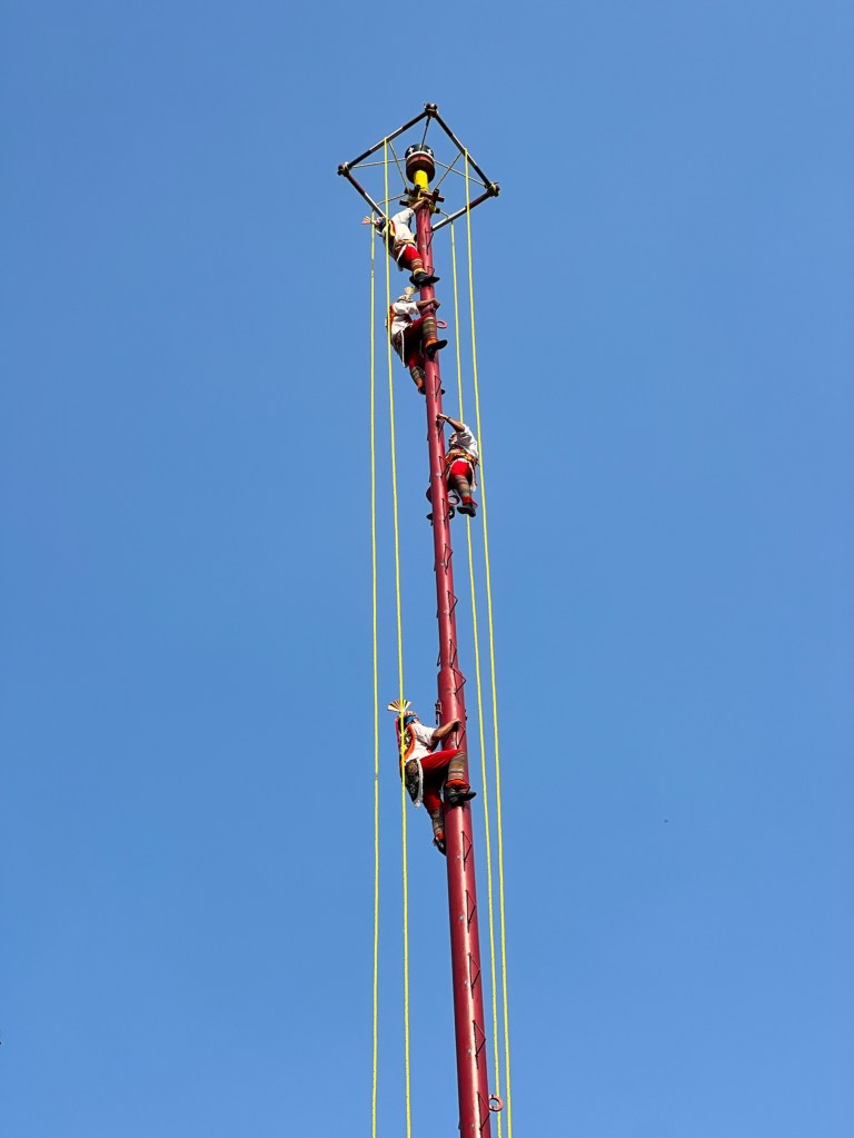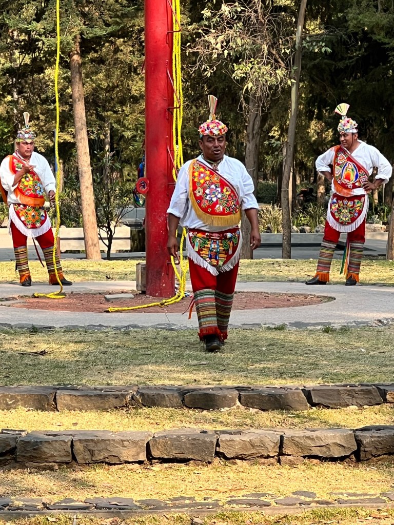 As we were leaving the park I spotted some unusual activity and went over to investigate. There was a crowd gathering around what looked like a maypole and some costumed men were busy shimmying up the very tall structure. I turned out to be a traditional ceremony for asking it to rain! Mexico has had more than its share of drought, and this is a rather dramatic ritual to try to get things watered. Once all five folks were at the top, four of them (apparently representing both cardinal directions and key life elements) jumped off and rotated while hanging from the end of ropes as they slowly lowered to the ground. Quite a spectacle.