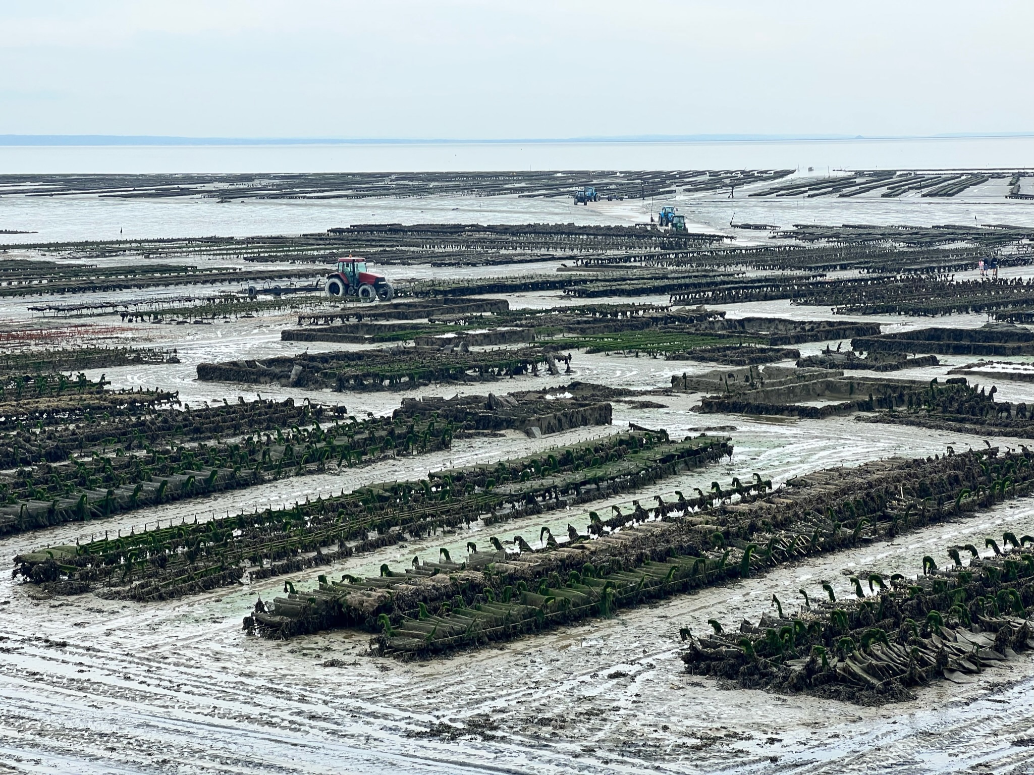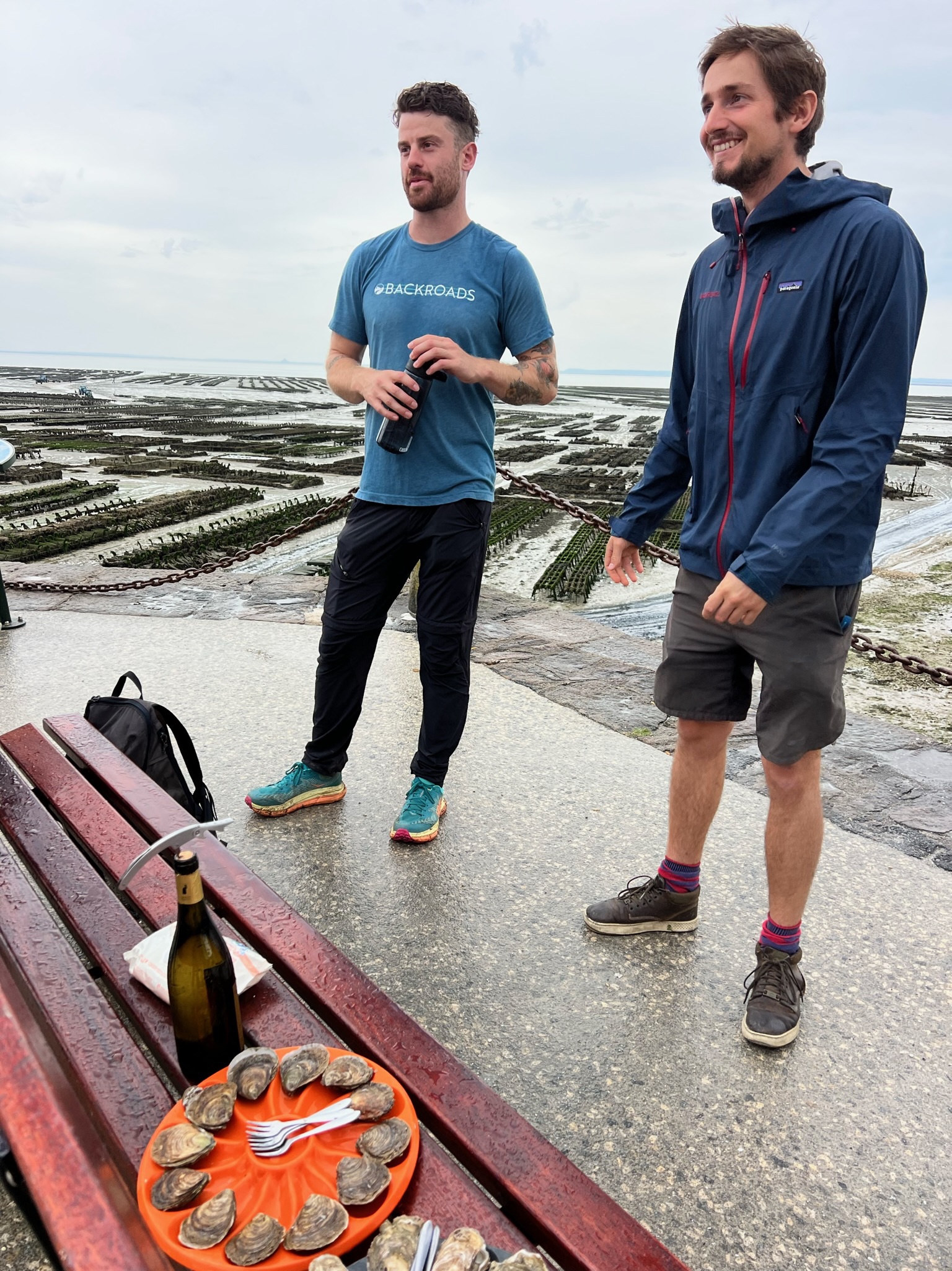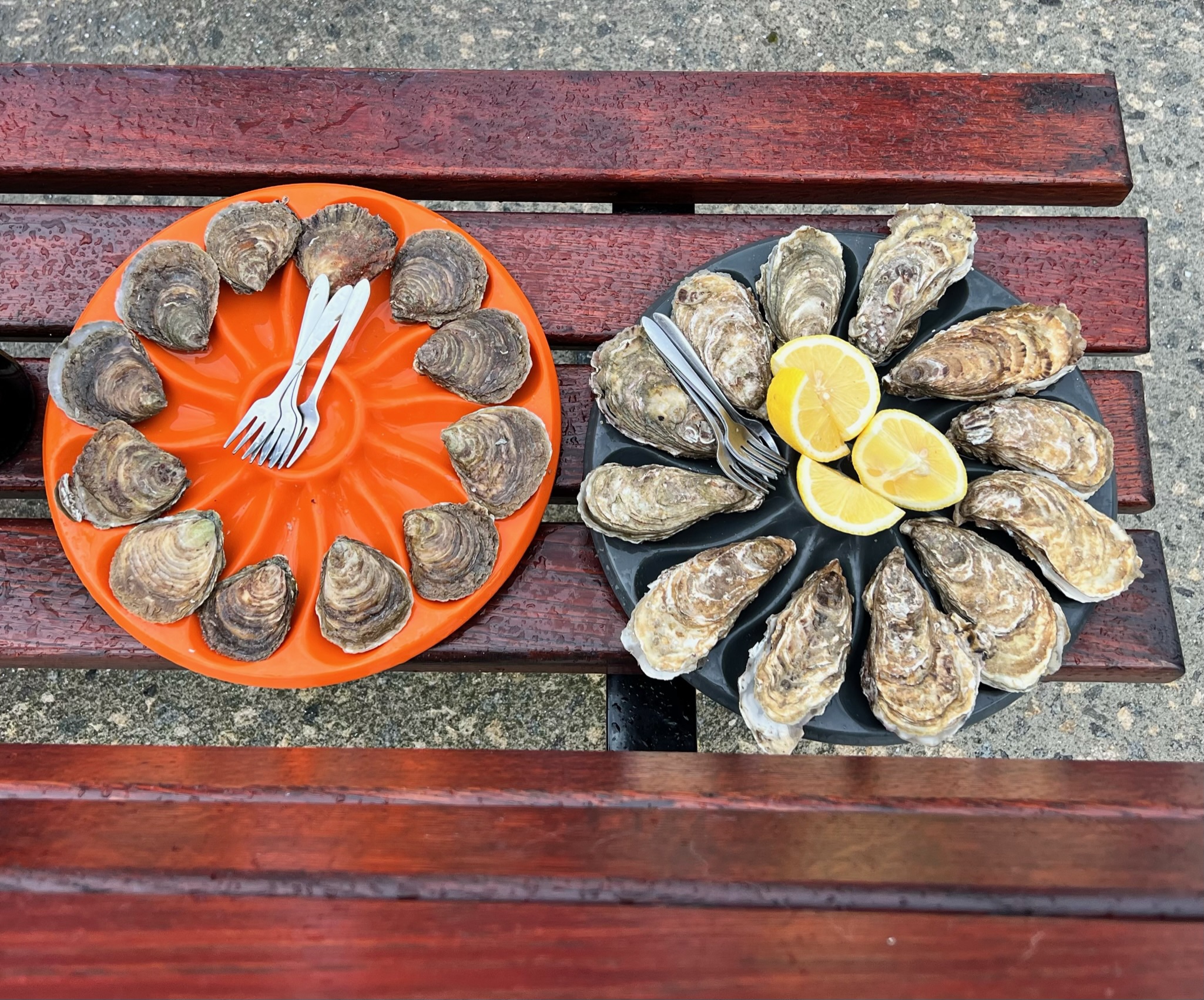Our stop at the end of our first walking day was overlooking a working oyster farm. It was interesting to see the complex of catchers and trucks that pick up the bounty. These slimy sea creatures are not my cup of tea but for those in our group who love them the guides prepared a tasting.
