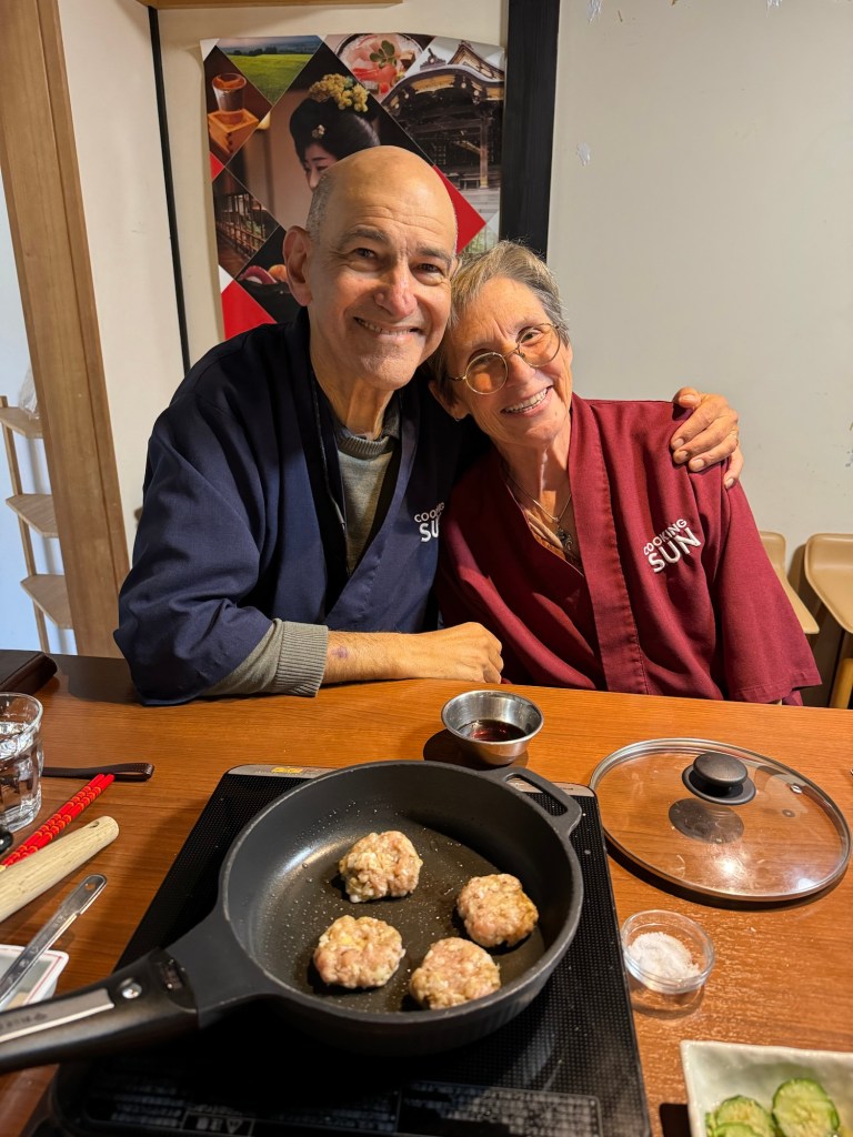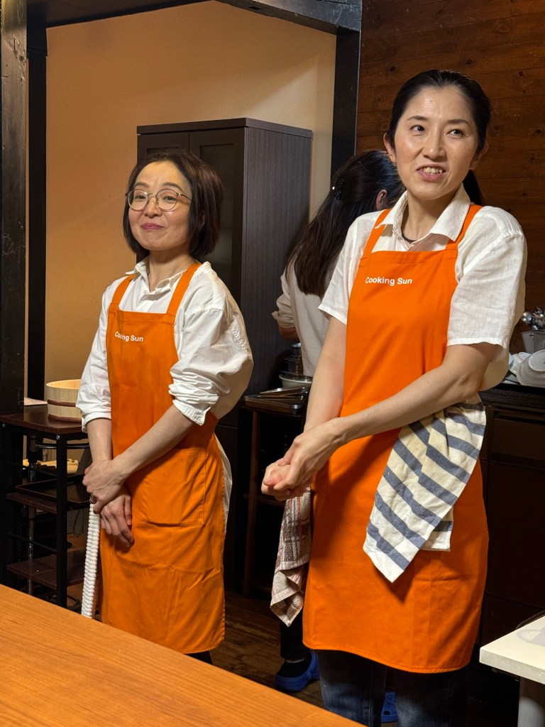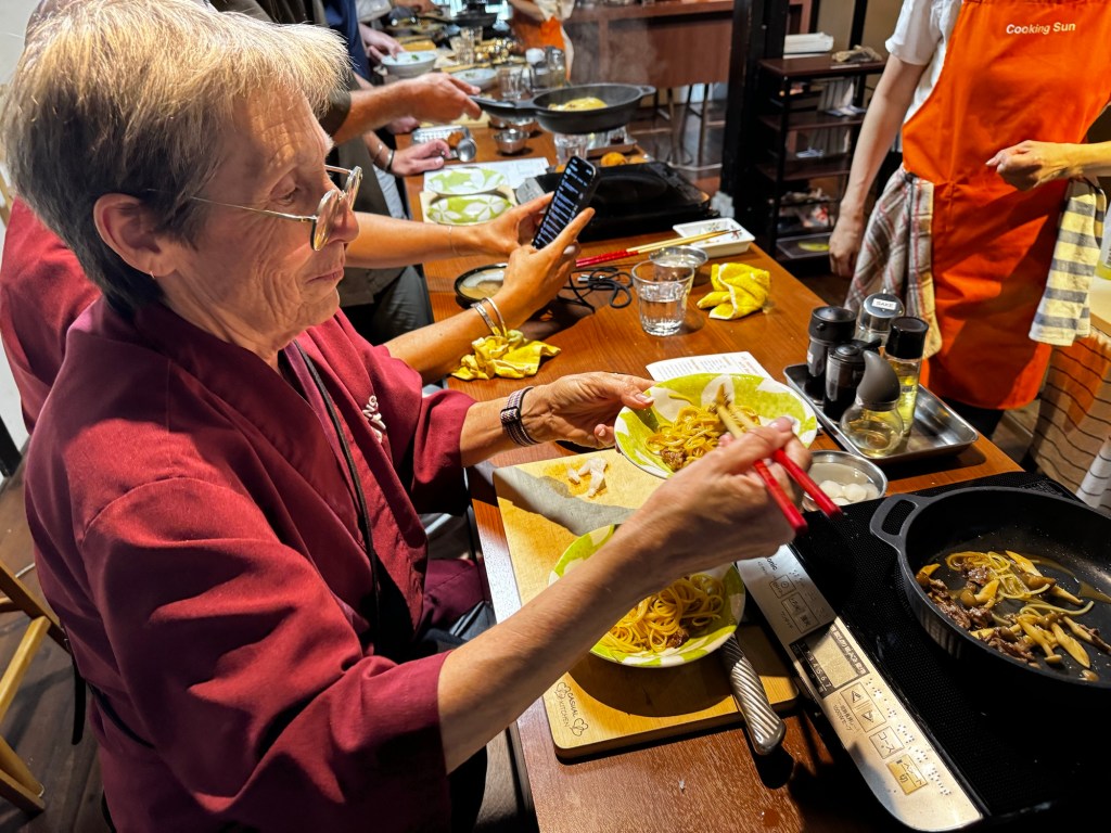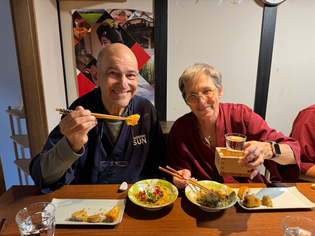 One other planned activity in Kyoto was a cooking class. There were about ten of us from all over with two local instructors with decent English. It was particularly fun sitting next to two guys who were professional chefs who were in Japan to specifically learn recipes they could take back home. They put us to shame on chopping, sauteing, and presentation! Of course, the very best part was that we got to eat what we cooked – made us follow instructions VERY carefully.