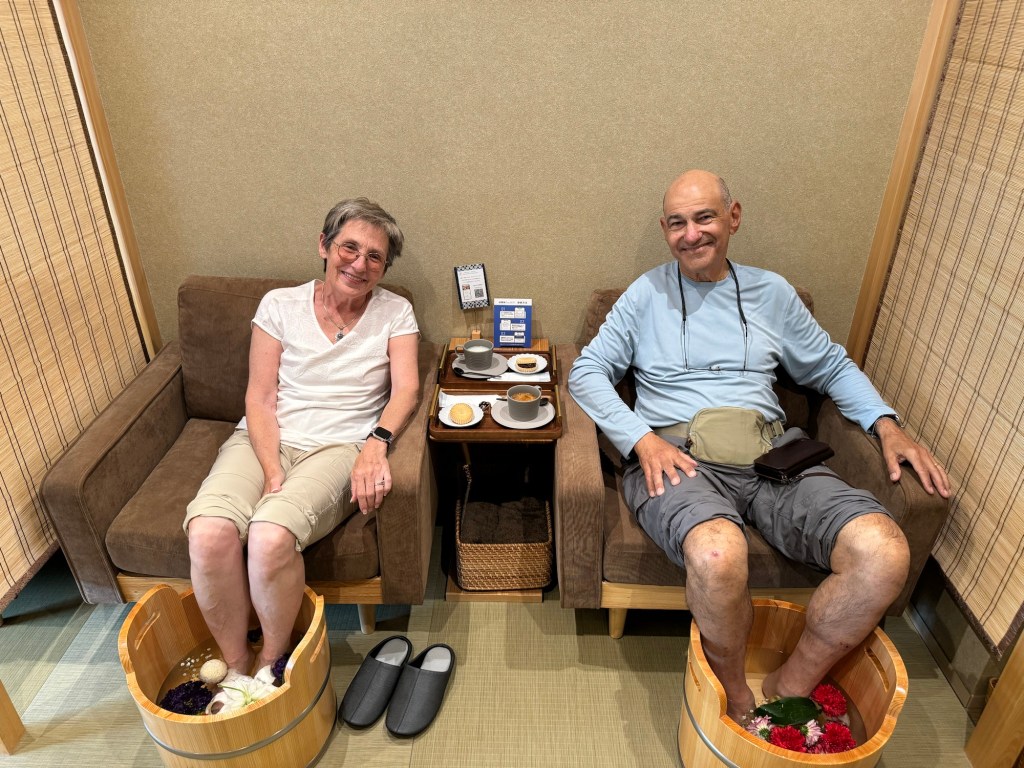 We were very fortunate to have booked into a nearly brand new, small hotel (Gion Elite Terrace) right in the middle of the historic district of Kyoto (the Gion). We loved being walking distance to the vast majority of historic and cultural sites, and the rooms were cozy…we even had an in-room dry sauna, a soaking tub, and a private little garden. The included breakfast buffet included both Western choices and some typical Japanese favorites, and there were abundant samples of Japanese skin care products that ended up converting me to one of the brands!