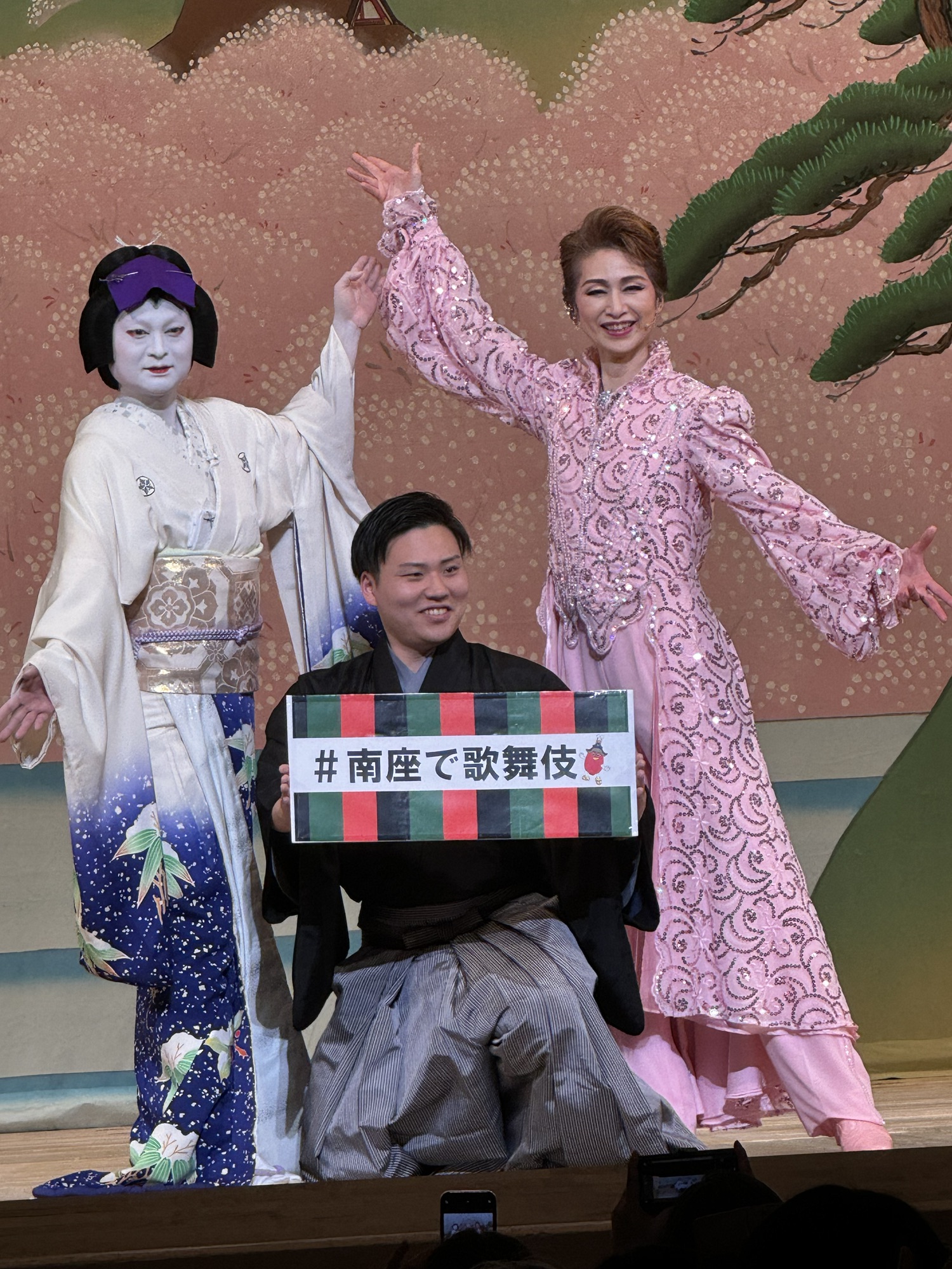 Below: The actor on the left is a Kabuki actor – male – playing a female character. The woman on the right is a well-known Revue actor – she plays many male character roles as well. (The guy in the middle? Not sure!!!!)