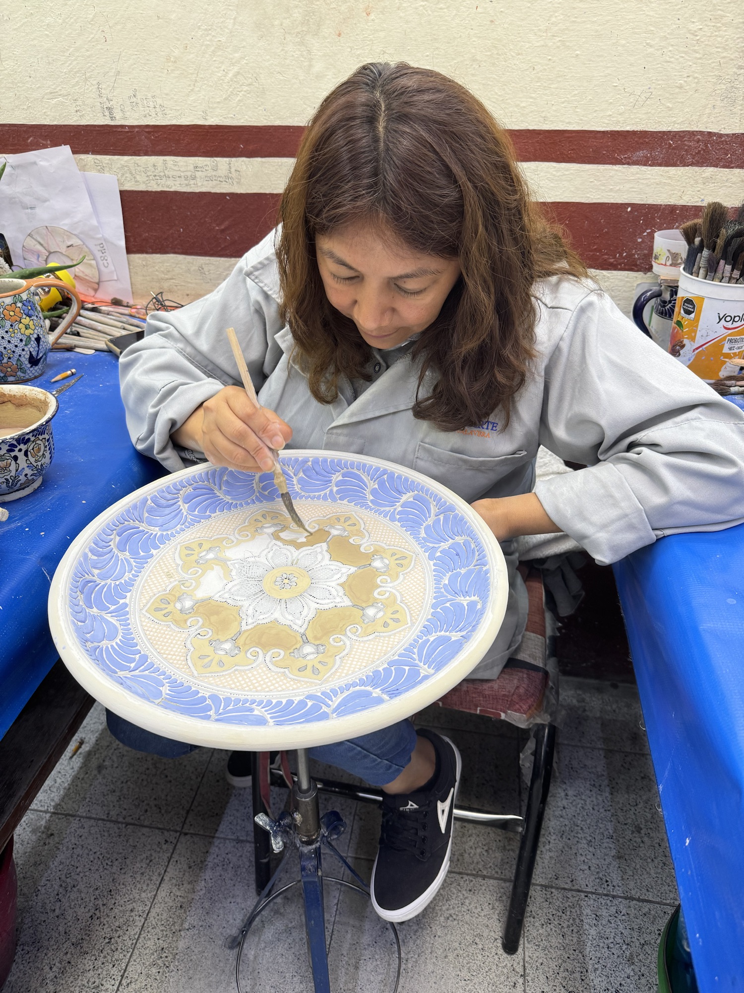 A real highlight of our day was a tour of the Talavera pottery factory and showroom. Artisanal Talavera of Puebla and Tlaxcala is a Mexican pottery tradition with heritage from the Talavera de la Reina pottery of Spain. The Mexican pottery is a type of tin-glazed earthenware, with a white base glaze. It is now only made in the town of San Pablo del Monte in the state of Tlaxcala and the cities of Puebla, Atlixco, Cholula, and Tecali in the state of Puebla. Pottery is made in these locations because of the quality of the natural clay found there and the tradition of production which goes back to the 16th century. The decorating of this pottery is by hand – from stenciling the designs, to painting the intricate patterns, to signing every piece.