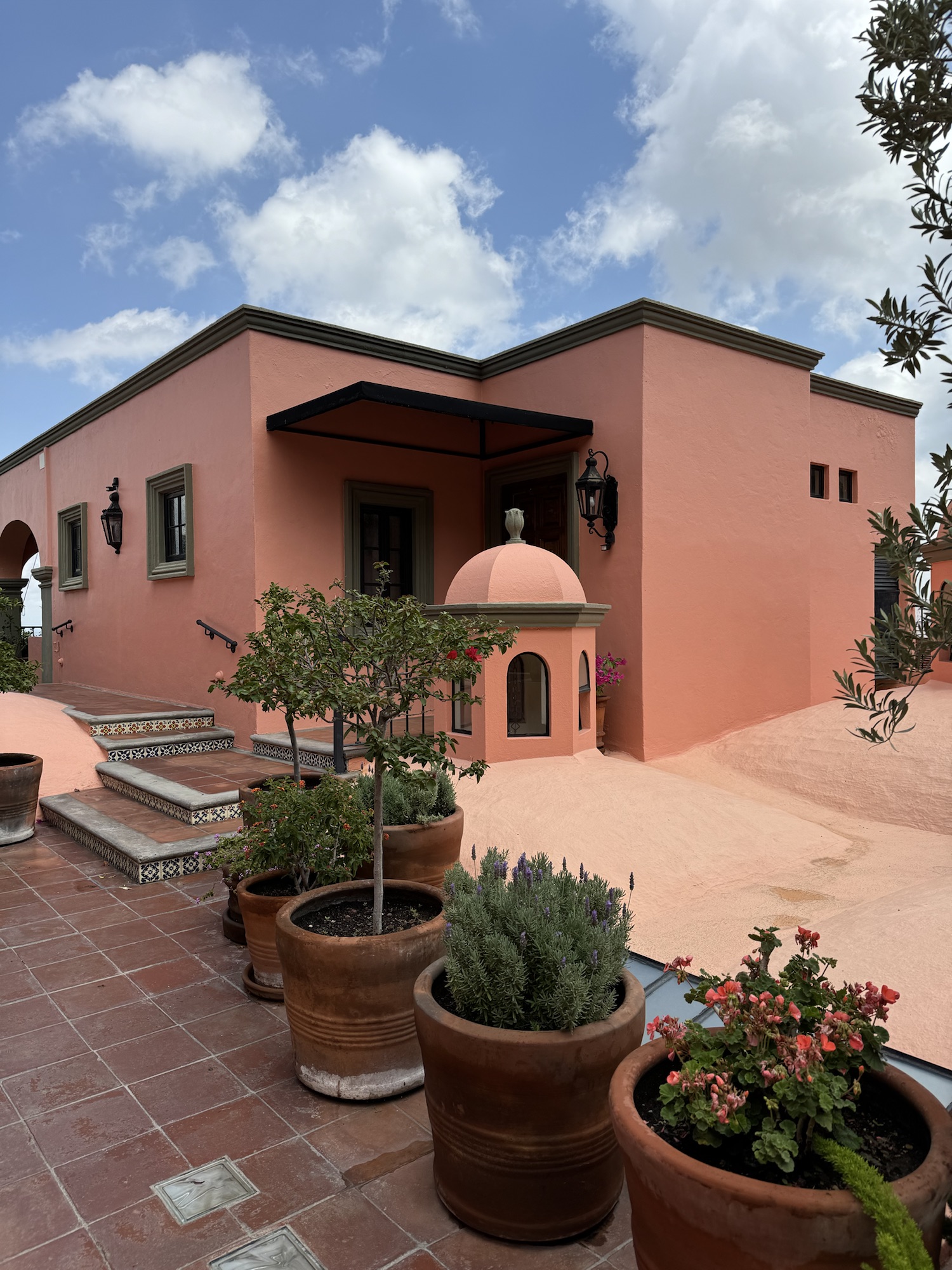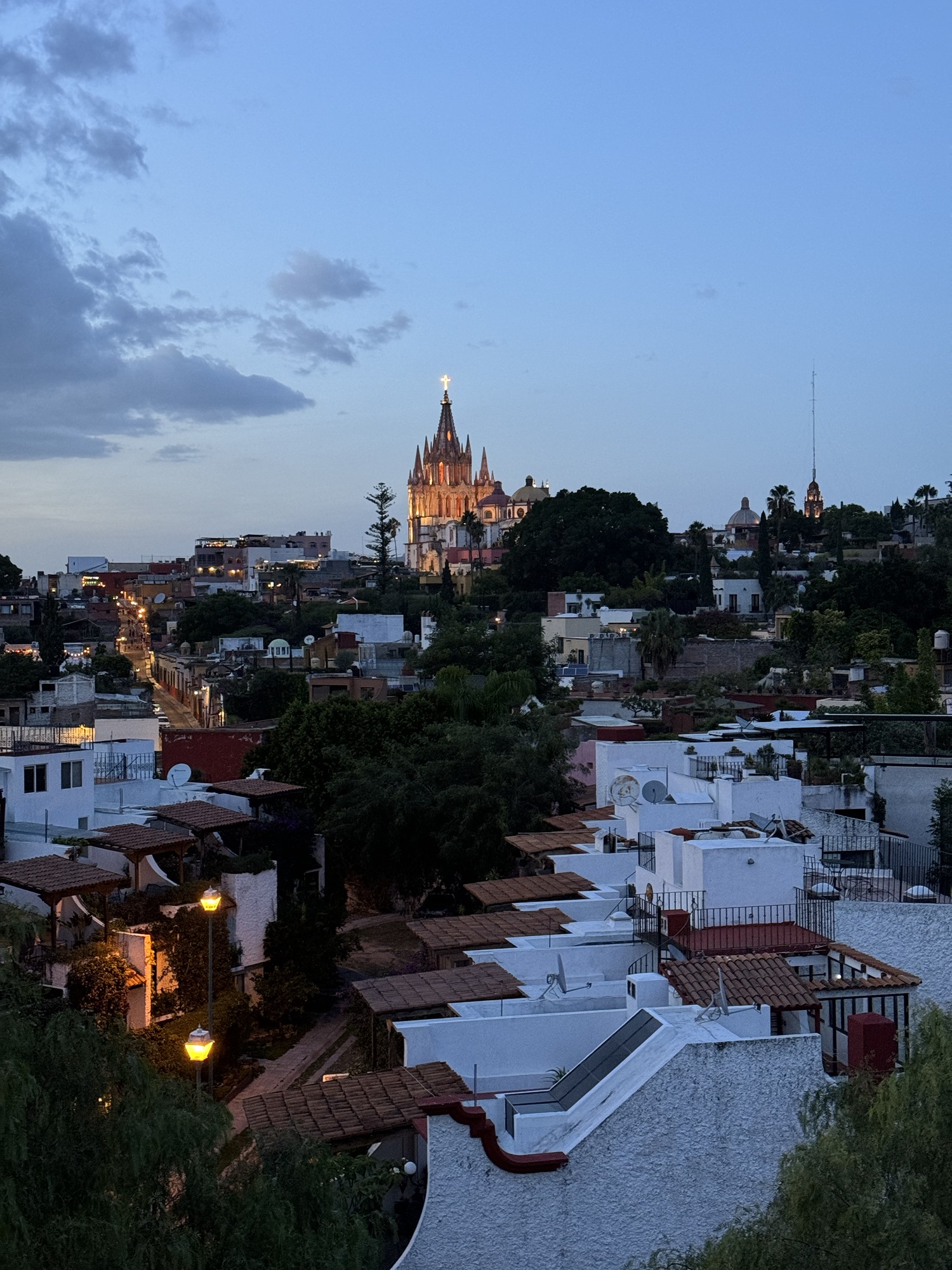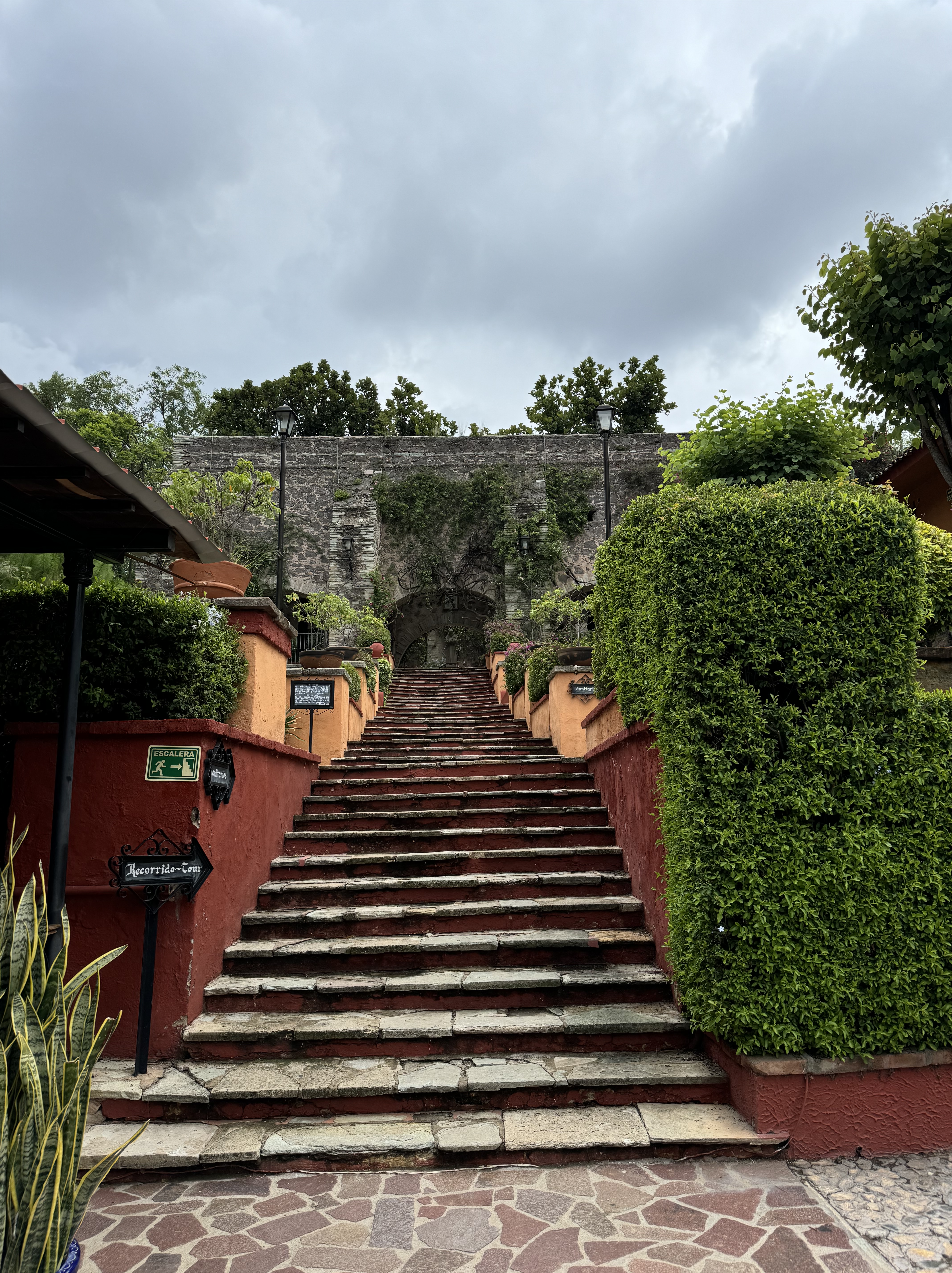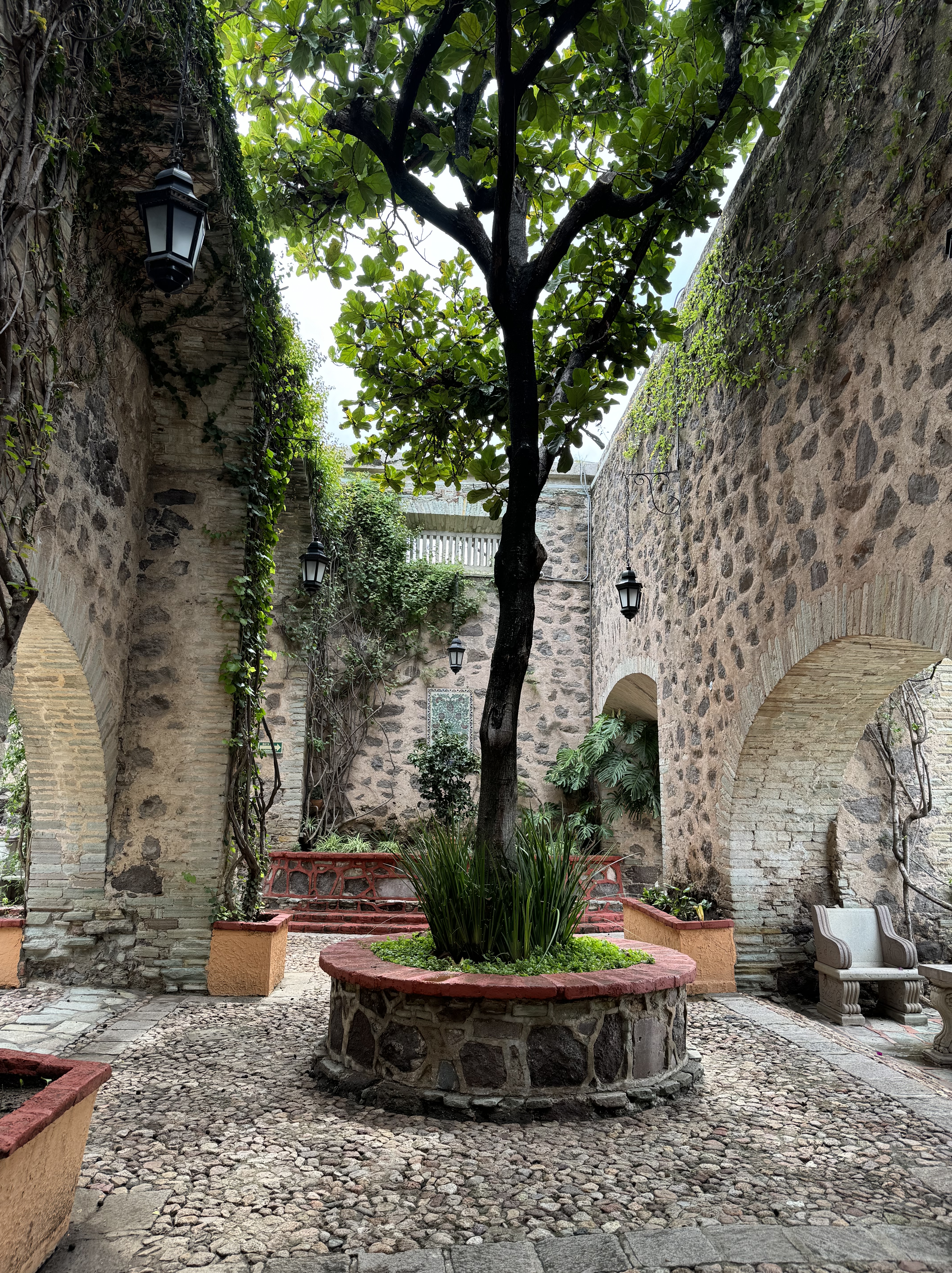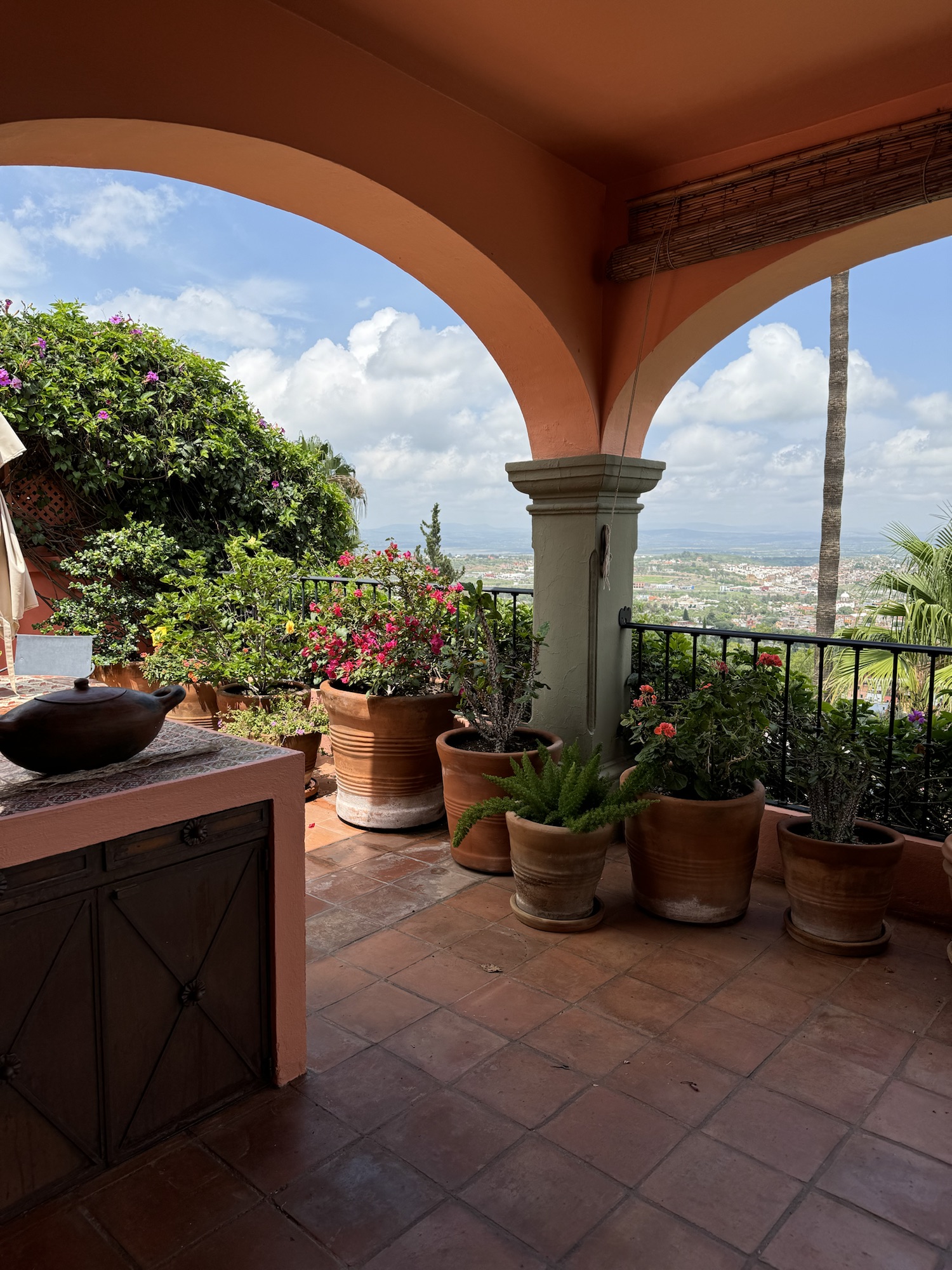 Our next stop was to San Miguel de Allende (SMA), a place I’d heard about for many years and wanted to explore. We were fortunate to be able to stay in an incredible home – a villa, really – by using home exchange “points” while the owners (Americans who emigrated to SMA a number of years ago) were at the Mexican coast for their own adventure. The attraction of SMA has always been as a center for arts and fine culinary experiences. The city sits on very sloped terrain and most roads are made of cobblestone – we definitely got a lot of steps in and worked our legs climbing down to the center city zocalo and back up to the house! It was clear that the city had developed its own unique look and feel further as a magnet for tourists…there is a special terra cotta red cast to most of the houses and shops heading into the center, and the restaurants aside from a few local dives and coffee haunts touted rooftop bars and fancy cocktails.