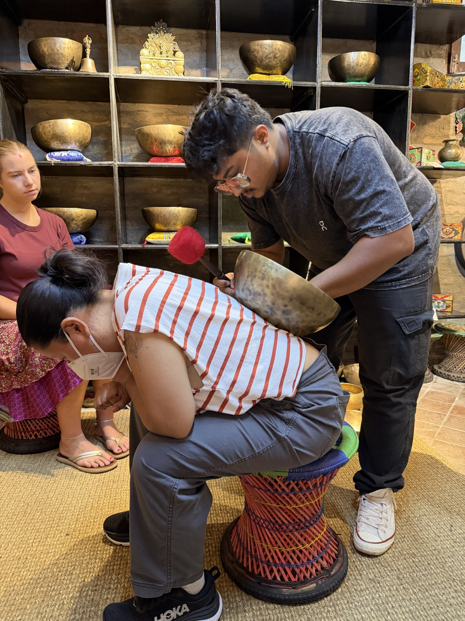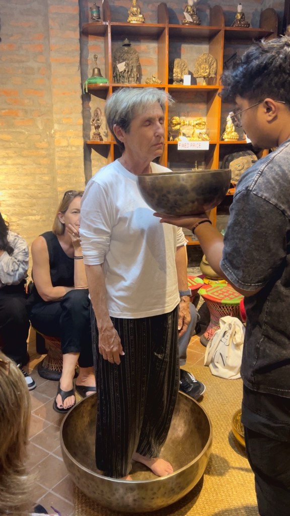 Right next to that complex was a street with some of the more upscale artisans and authentic textiles, etc. We ended up at a studio that both created and sold singing bowls. A singing bowl is a type of bell that produces sound and vibrations. Singing bowls sit with the bottom surface resting on a table or the floor. When you strike or circle the rim of a singing bell with a mallet, it emits a rich, harmonious tone that resonates for a long time. The sounds are believed to help with meditation by helping you focus and creating a tranquil environment. The vibrations from the bowl can also be felt physically, adding a tactile element to the meditative experience. Singing bowls are usually made from metal alloys, including a mixture of bronze, copper, tin, iron, and other metals. They’re often handcrafted, which makes each bowl produce a unique sound and can also be made from crystal, which tends to produce a purer, more sustained tone. Larger bowls typically produce lower, more grounding tones, whereas smaller bowls create higher, more uplifting sounds. We learned how these bowls are used for therapeutic purposes. A few of us bought bowls – the one I purchased for my brother was a “full moon” bowl that was created only on days/nights of full moons…it took at least four months to make it.