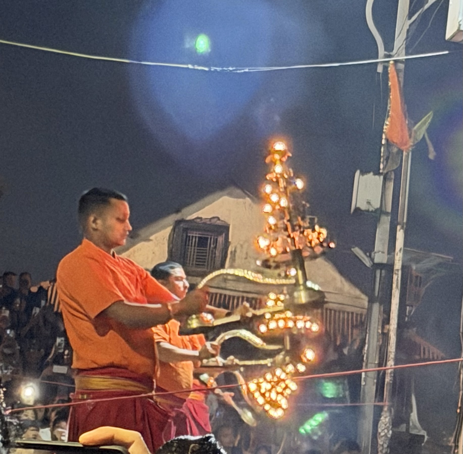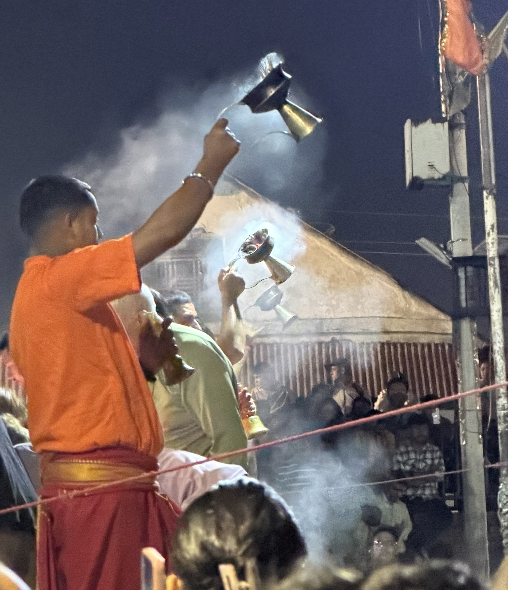 Along the opposite riverbank, cremation ceremonies took place – echoing Hindu beliefs about the soul’s journey and the impermanence of physical existence. This involves a processional that must take place within 24 hours of death. The body is wrapped in white sheets and brought to the riverside. It is cleansed by family members, then the body is re-wrapped and taken to a platform where a fire is built and the body is burned. This whole process is witnessed each night by thousands of people lining the riverbank. Atop one of the temple buildings we spotted some monks performing what is called the “death meditation” where one must watch with open eyes the entire body burning process.