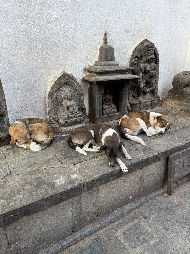 This too is a UNESCO World Heritage Site that is likely over 2,500 years old – one of the oldest Buddhist sites in Nepal. Interestingly, this site is sacred to both Buddhists and Hindus, with various temples, shrines, and religious symbols and sculptures intermingled over the hilltop. Most visitors climb 365 steep stone steps to reach the main structures with each step representing a day of the year. Once we got to the top area of this complex we were greeting by dozens of monkeys!!! These monkeys are considered sacred and the community surrounding the area make sure these playful creatures are well-taken care of. It was a blast encountering groups of monkeys roaming freely at our feet – sometimes trying to snatch a snack or a water bottle out of the hand of an unsuspecting visitor. There were a few dogs roaming around as well and it was very clear that monkeys and dogs would rather not be tenants together…they mainly kept respectable distance from each other.