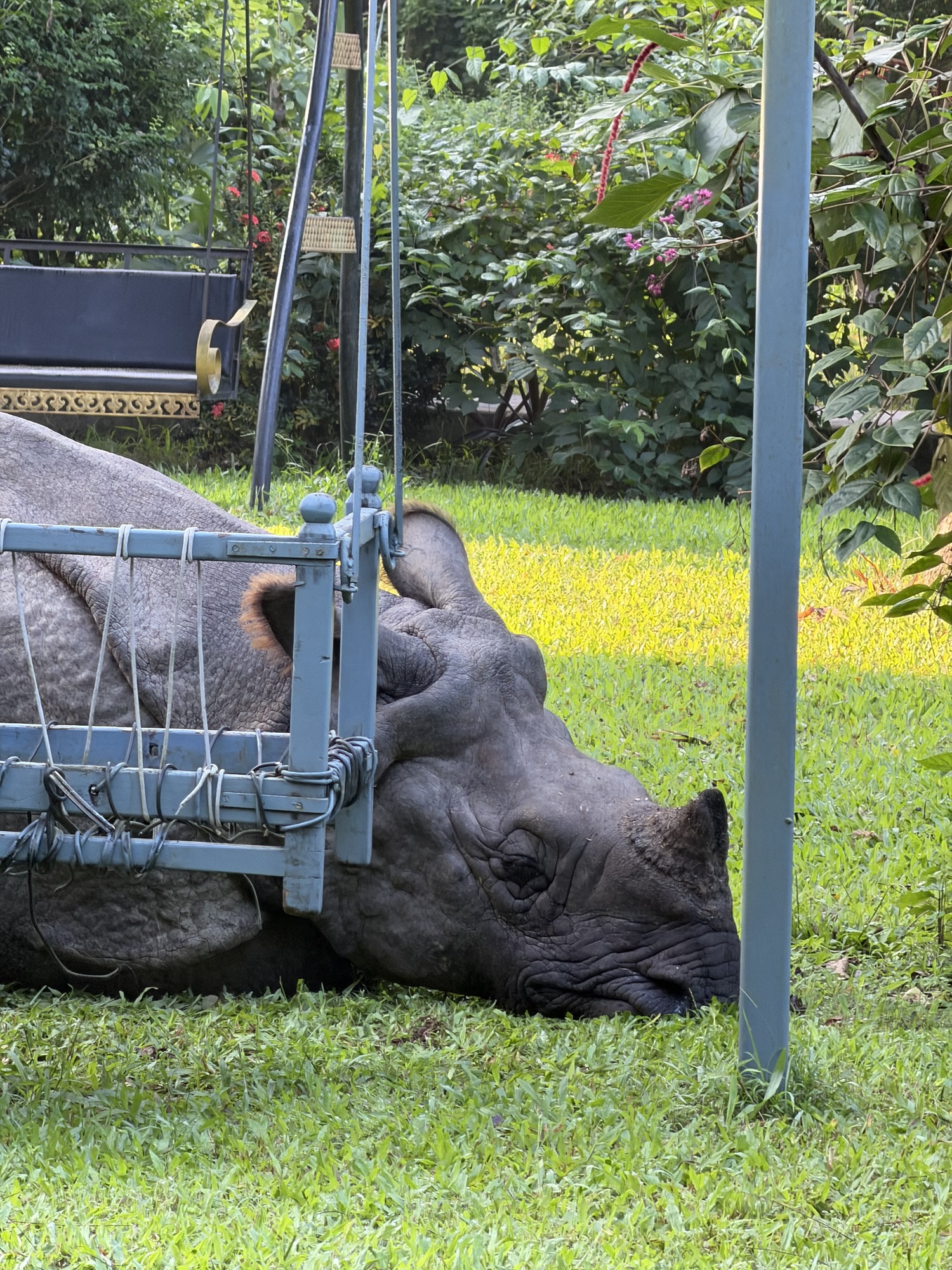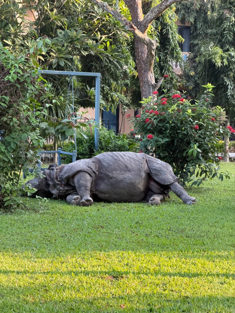 The first morning we took a walk next door to another hotel where Laura had a friend and as we strolled the garden there, we came upon a sleeping rhino! Yep, a wild rhino just taking a snooze in the middle of the hotel grounds. He’d apparently walked over from the nearby jungle. We were that close to wildlife. Of course we were warned to just let him sleep. We did.