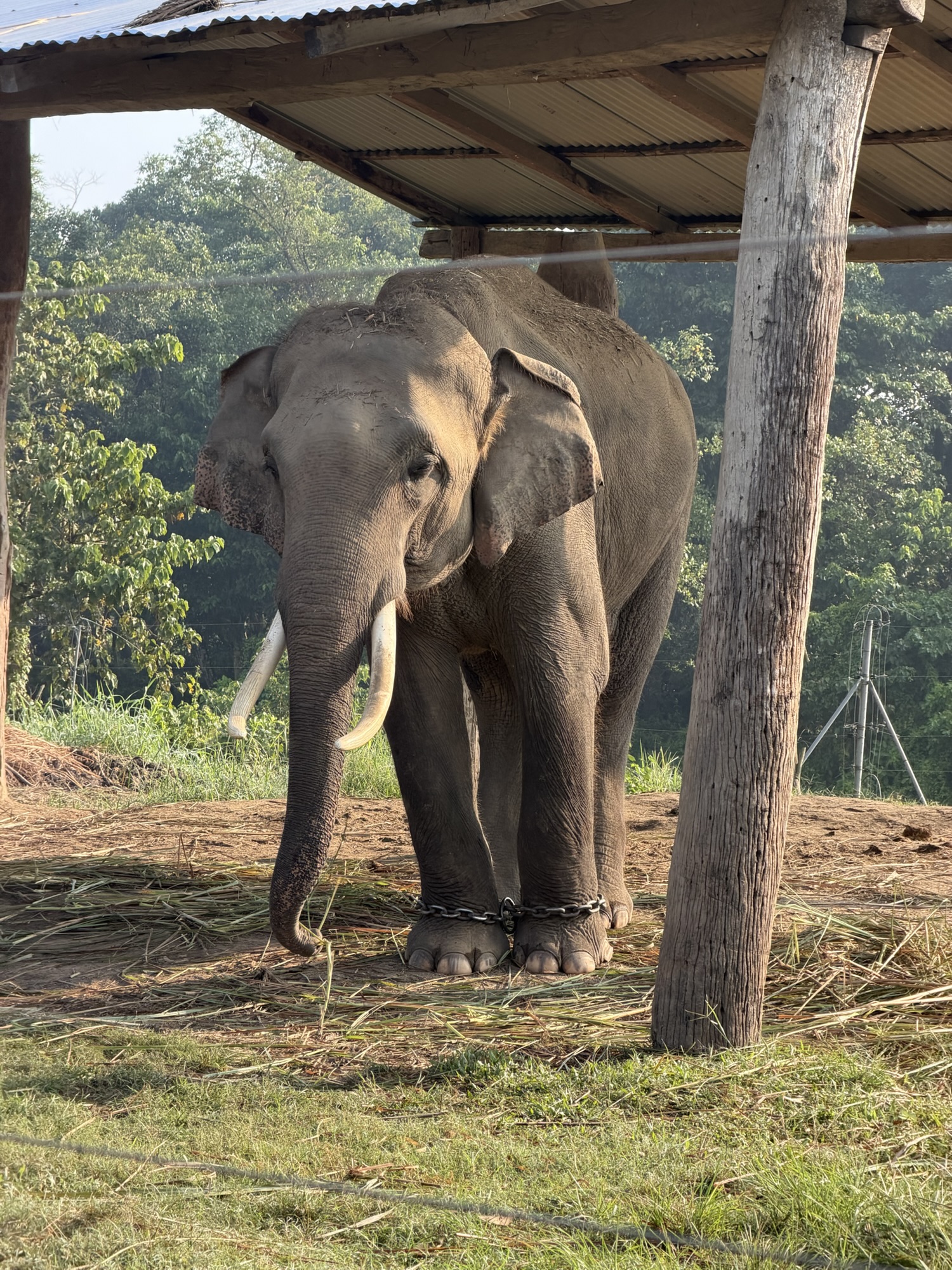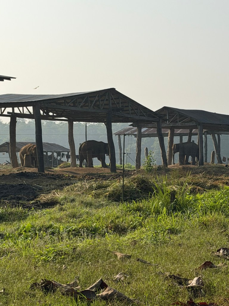 We took a walk into part of the park where elephants are captured, chained up, fed and put to work in the park – sometimes gather building materials and sometimes working with guards protecting the border with India. We all had very mixed emotions seeing this. While these elephants were being fed and protected from use by local hotels and vendors cashing in on the novelty of riding an elephant, they were bound and unable to roam freely as they would in the jungle. This is a complex issue in Nepal and we learned about various animal conservation efforts (including elephants) later in the trip…You’ll have to keep reading!