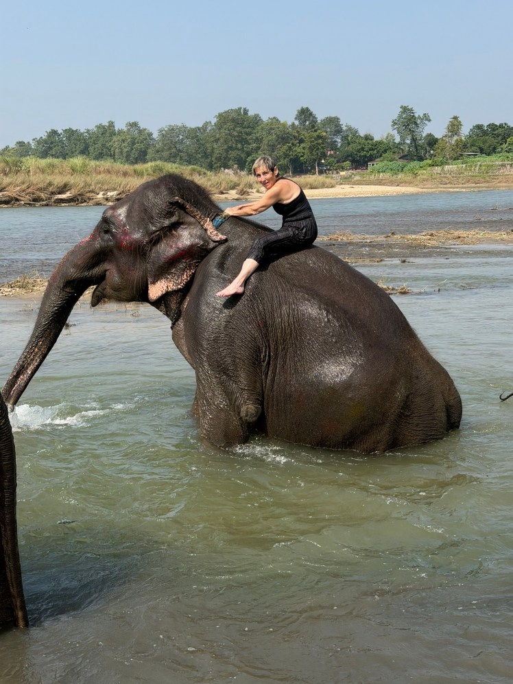 By happenstance, I was down by the river later in the morning and came upon two adult elephants and their handlers in the water beginning some sort of a cleaning & bathing process – I was invited to come help…and at the same time sit on top of the elephant. There was no way I was not going to experience this. I waded into the river. with the help of the handler, and before I knew it, I was sitting on top of a large female elephant. She stood up, and it became clear that she was busy washing herself – and in the process washing me!