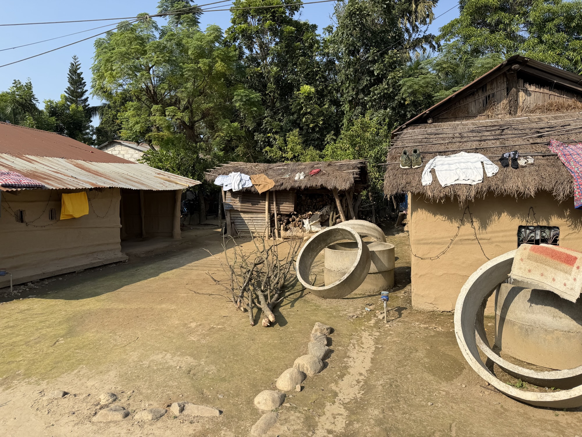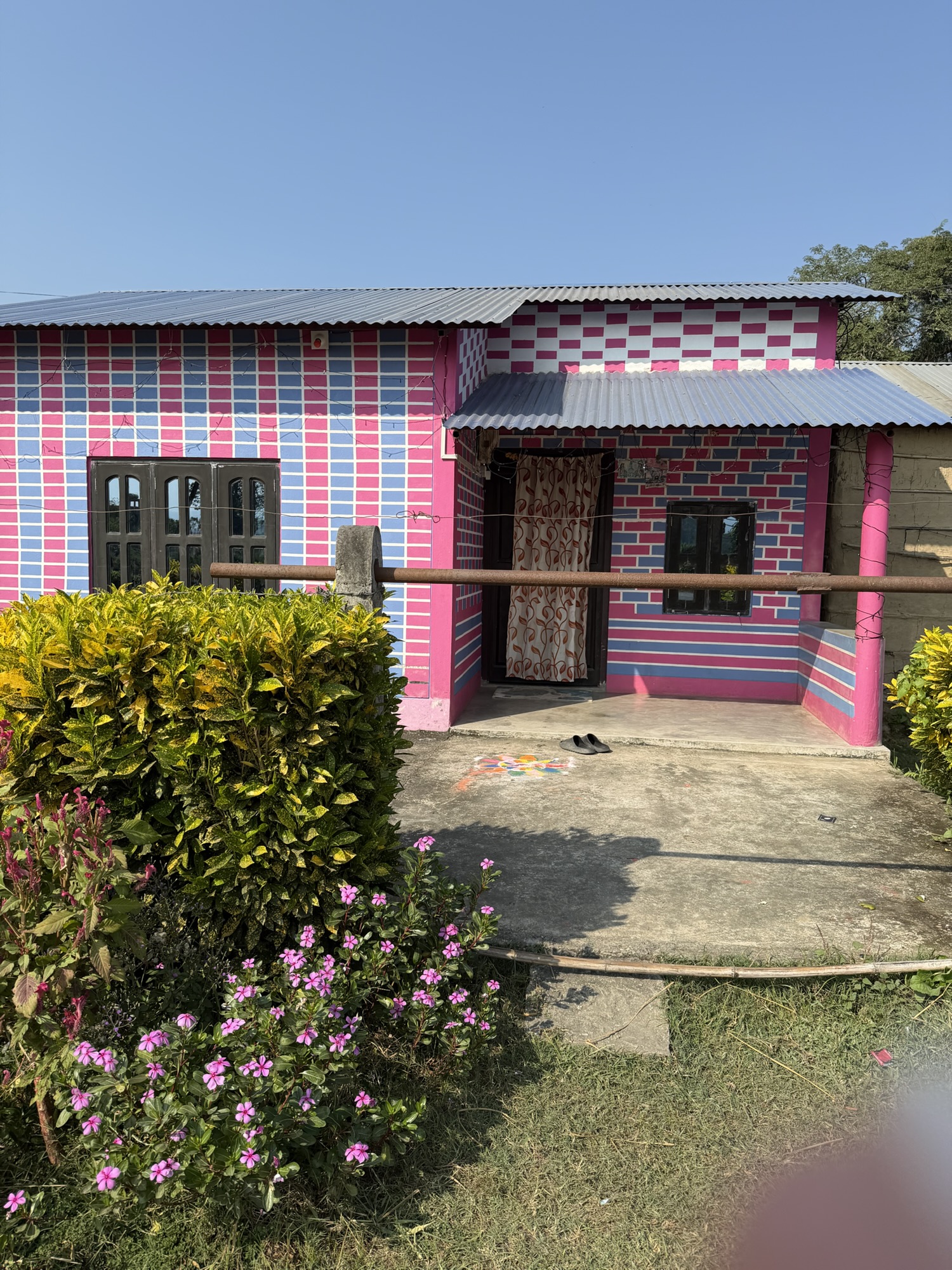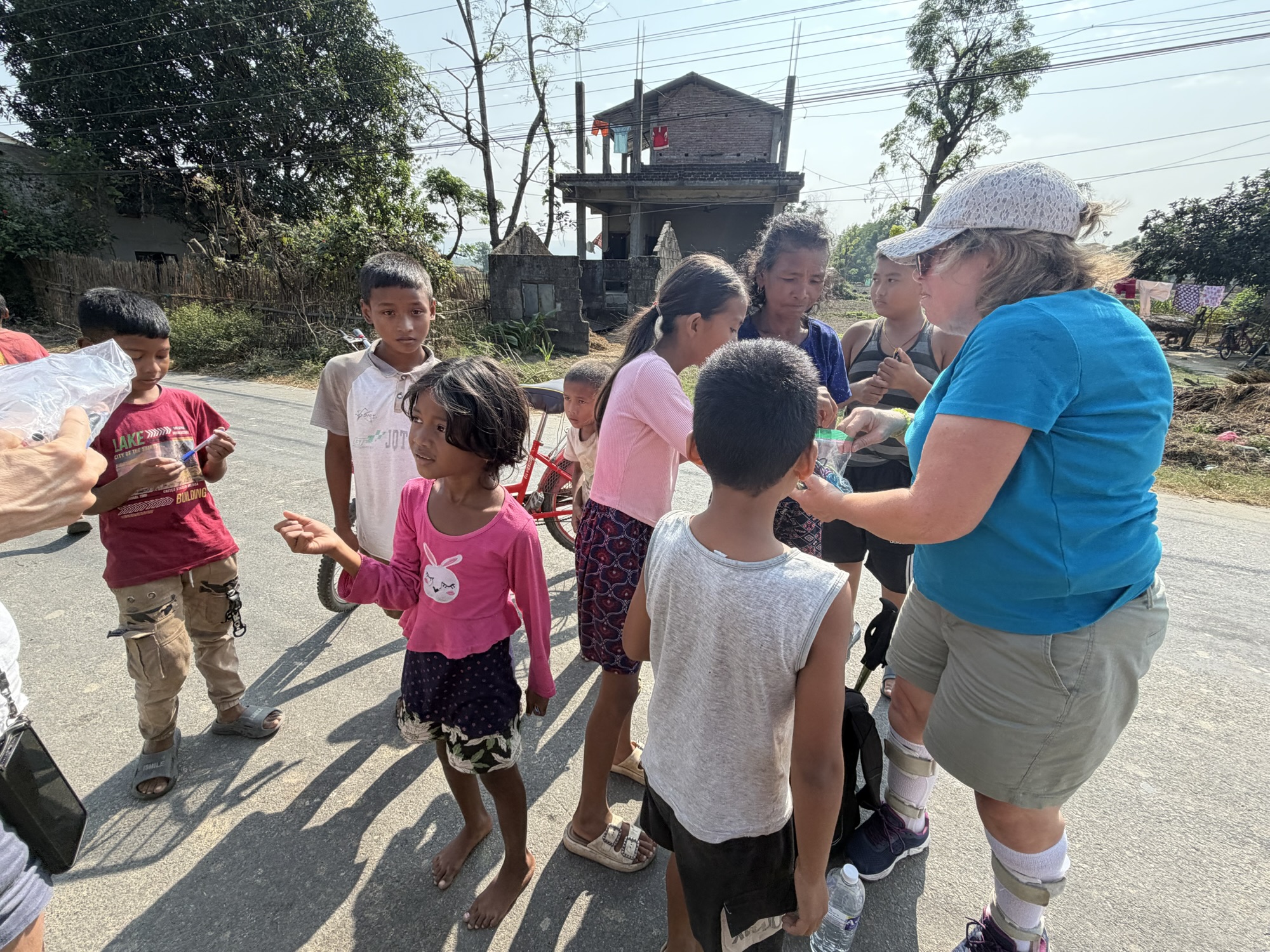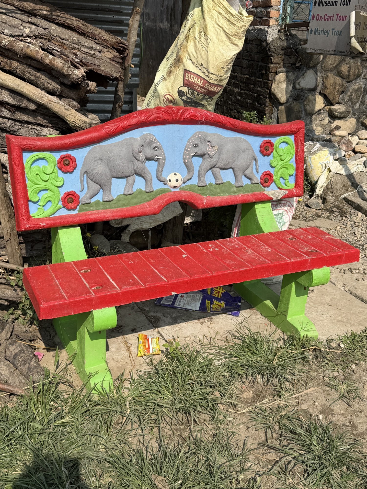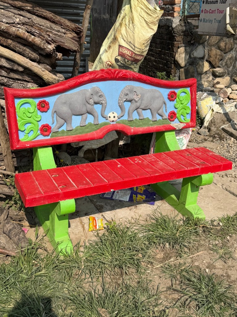 A few of us took a walk in the early afternoon through a neighborhood, mostly inhabited by people from the Tharu community. This is one of the largest ethnic groups in Nepal, with an estimated population of about 1.5 million in Nepal and around 170,000 in India. They predominantly inhabit the Terai region, which stretches along the southern border of Nepal and into parts of northern India. As primitive as their dwellings were, there were many that were in the process of renovation, many in bright colors and multiple stories. In the neighborhood, someone or the government funded painting benches along the main road with colorful depictions of local animals. There was even one of elephants playing soccer.