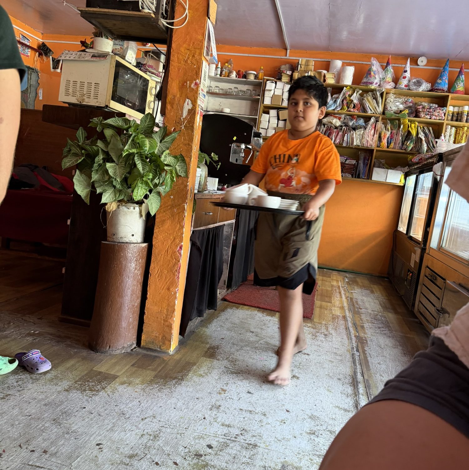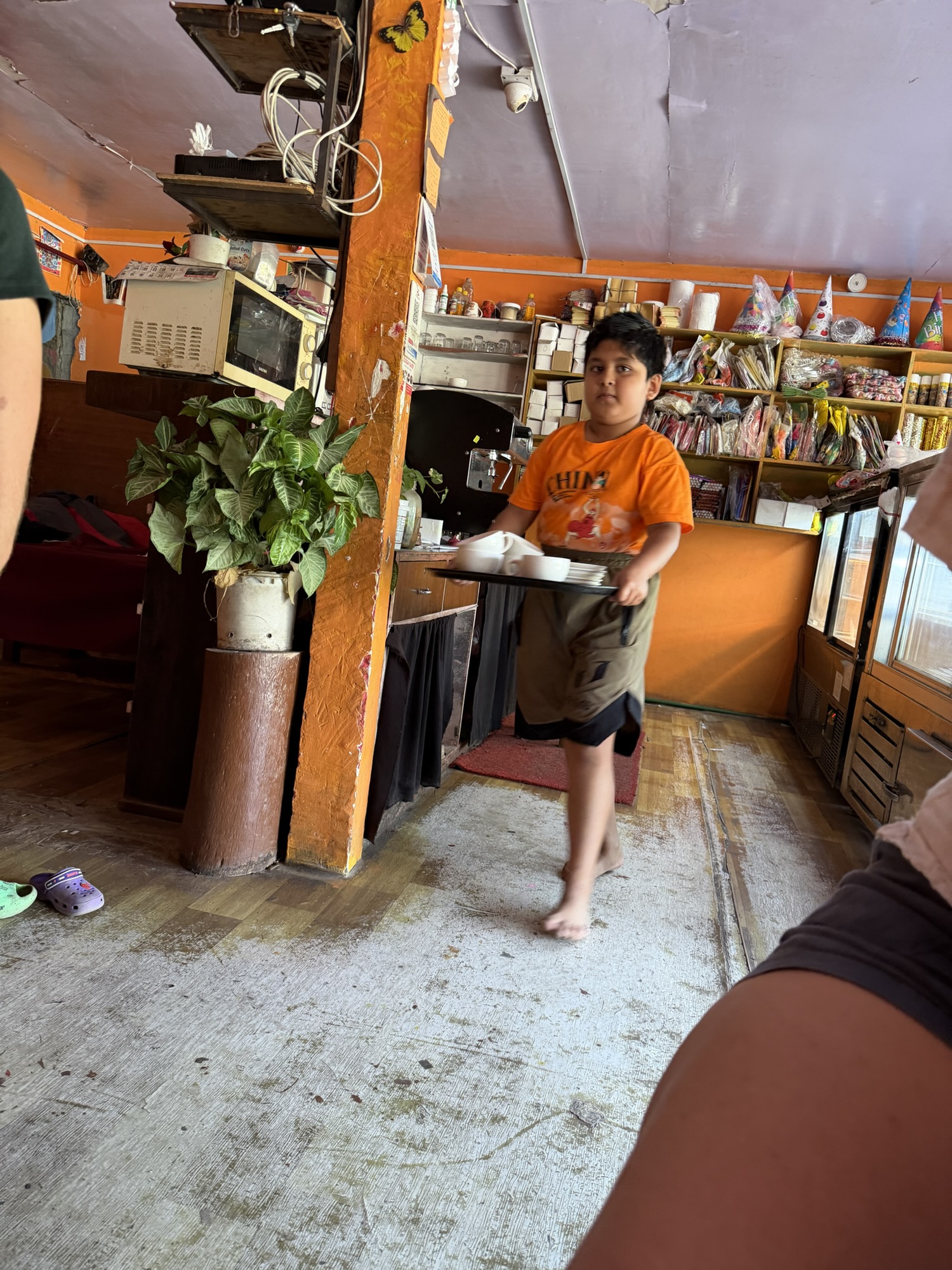 After a couple of miles of leisurely walking in what was very hot weather, we stopped to have Chiya, or milk tea, and some local pastry at a coffee shop that Laura and Julia know well. A 10-year-old boy was our server, the son of the owner. What a bright and industrious young man! He did a great job of taking our order, bringing pastries, cleaning, and setting up the table, and doing all the preparation around serving tea. That his mother took care of as I assume carrying a tray of hot liquid by a 10-year-old might not be such a good idea.