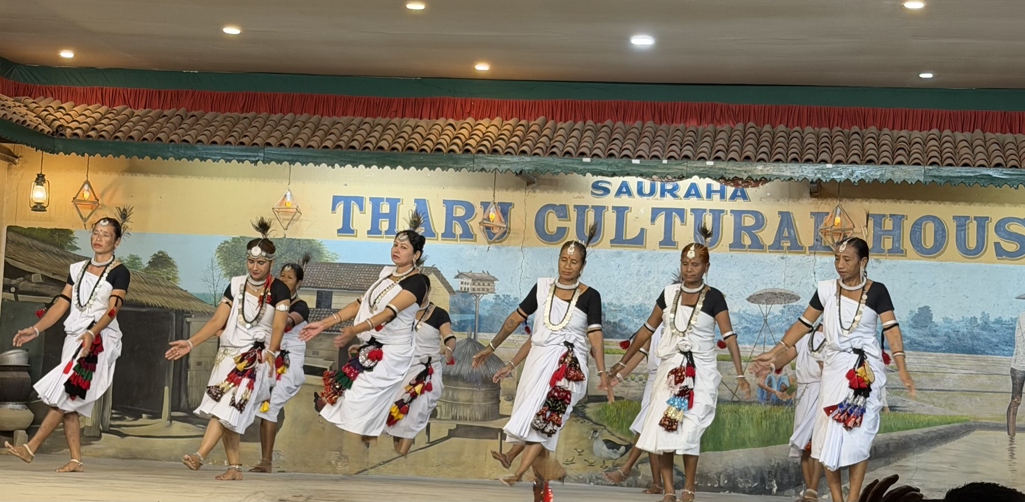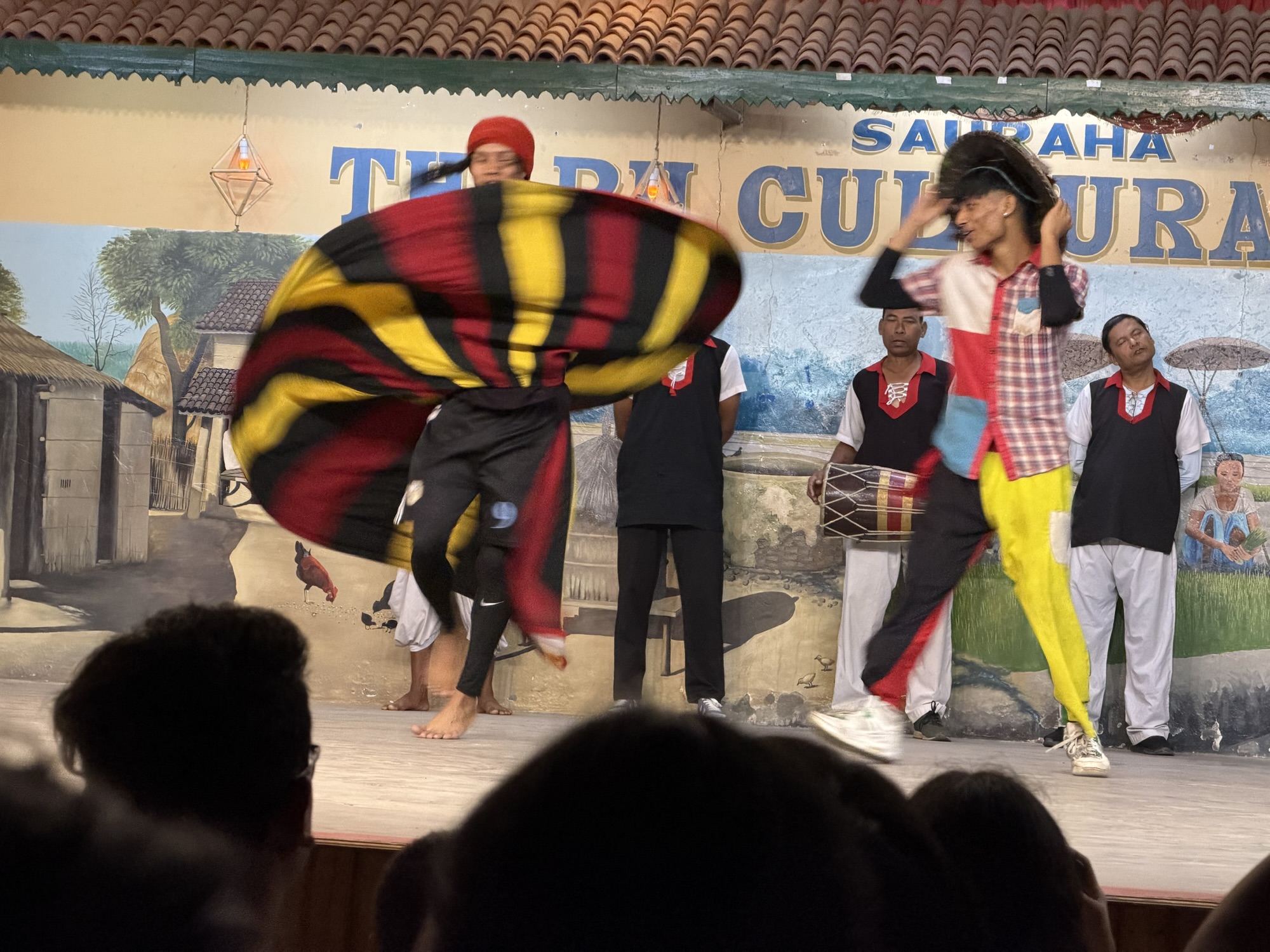 We had dinner at a lovely café nearby the hotel and then walked over to the Tharu Cultural center to see a colorful performance of dances tied to various festivals and seasons of the year. I was amazed that the vast majority of audience members were locals. This show is done nightly in the center of Sauraha and from the enthusiasm for the performers it was clear that the tribal themes and traditions reflected in the dances had deep meaning and familiarity for the people attending.