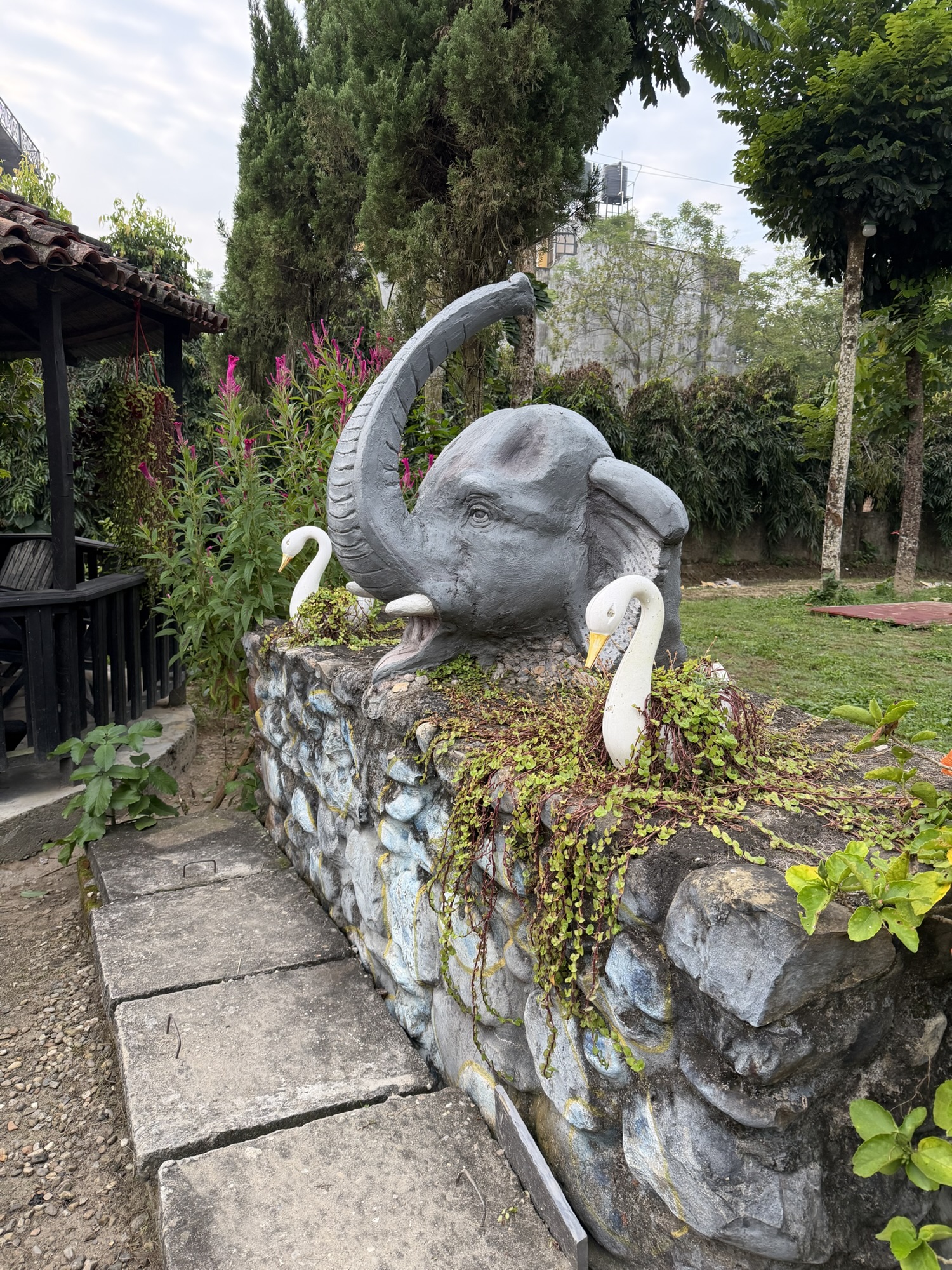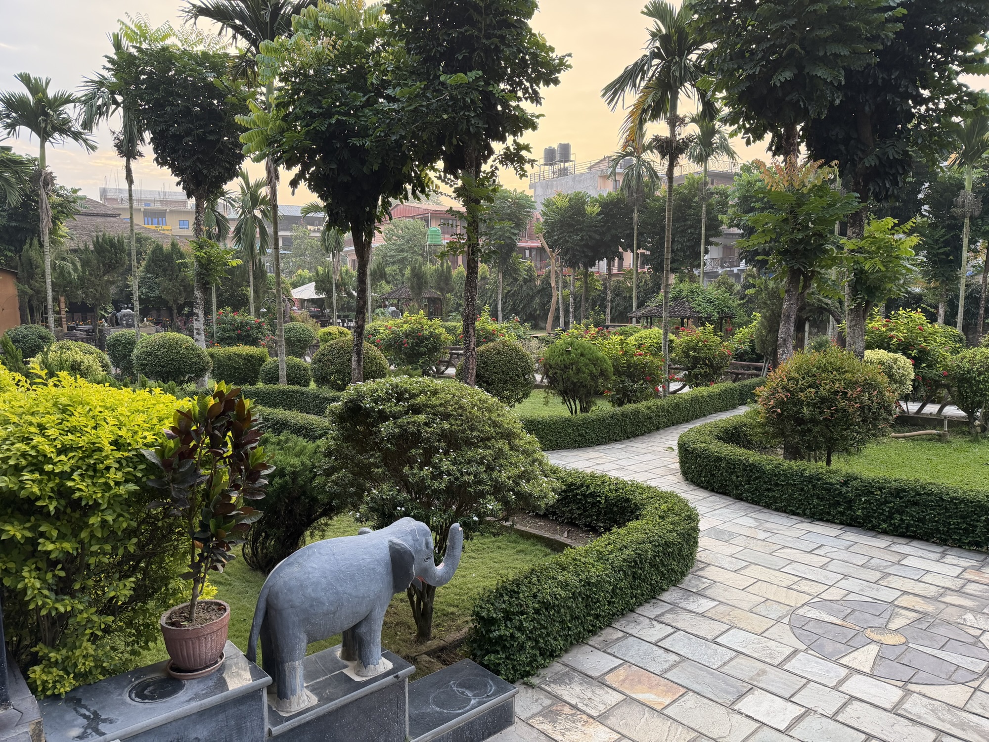 Quite different than the austere accommodations at the monastery, we had more cozy rooms and lush grounds at KC’s Restaurant & Home (hotel) that sits smack in the middle of the main road in Sauraha. The grounds are replete with gorgeous flowers and local animal carvings, and the restaurant on the premises served very yummy local dishes…along with my favorite ginger/lemon/honey tea.