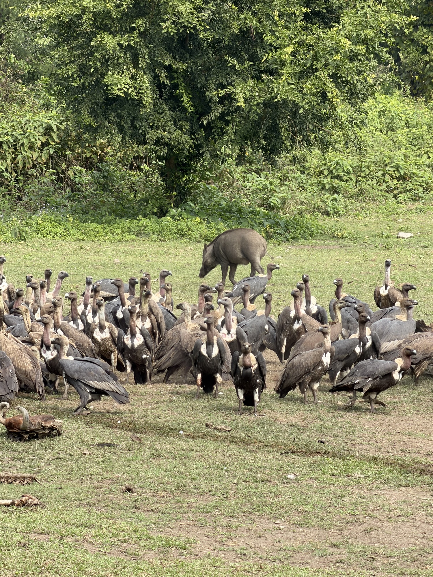 From an enclosed viewing station, we watched 409 vultures, one eagle and four wild boars descend on a cow carcass and literally pick it clean in less than thirty minutes. At the end – having been excluded by the vultures during the main feeding session – one of the boars made off with the spine and picked over bones. It was not clear whether the vultures were cool with that final action, but they did retreat to the surrounding trees.