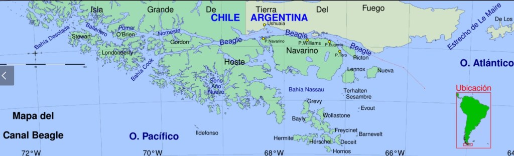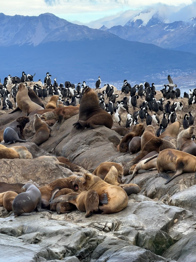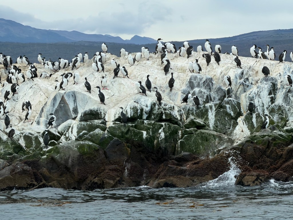 On the second day in Ushuaia, we took a catamaran tour of the Beagle Channel – a strait in the Tierra del Fuego Archipelago, on the extreme southern tip of South America between Chile and Argentina. The channel separates the larger main island of Isla Grande de Tierra del Fuego from various smaller islands. The Beagle Channel, the Straits of Magellan to the north, and the open-ocean Drake Passage to the south are the three navigable passages around South America between the Pacific and Atlantic Oceans.