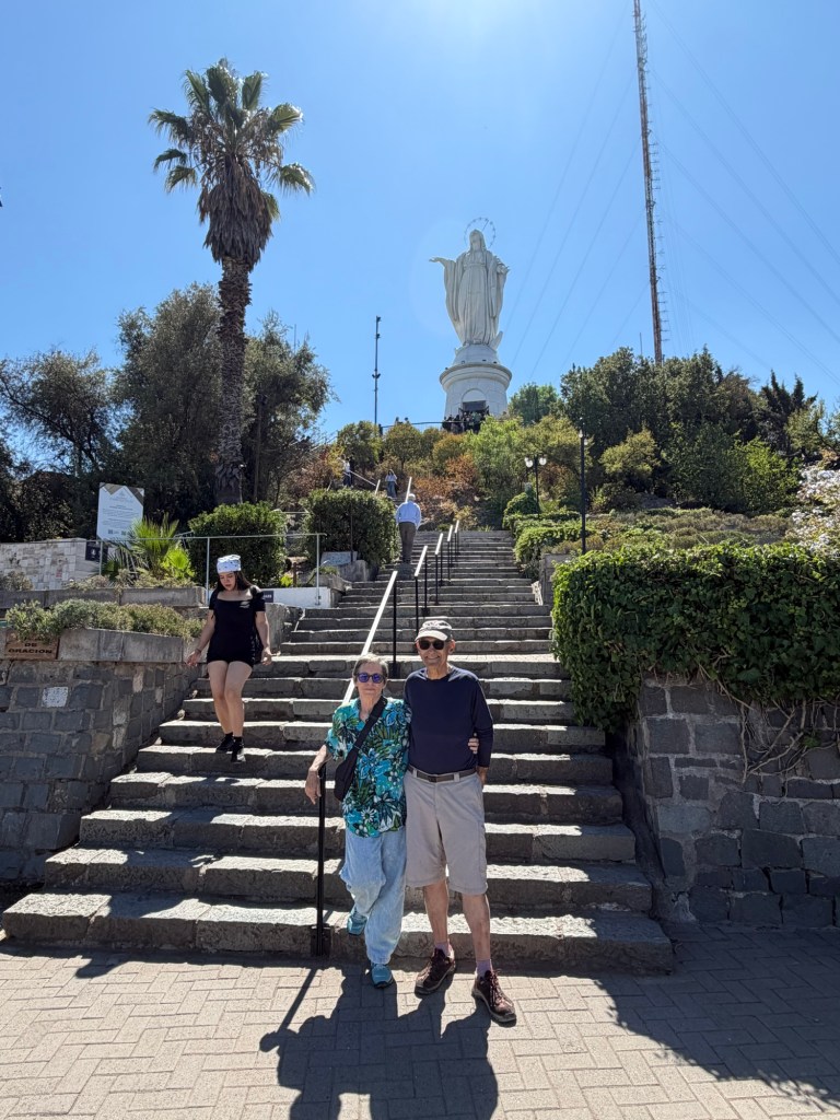 I have to admit that Santiago blew me away! This vast, sprawling, modern city is surrounded by the foothills of Andes and there are many incredible high ground vistas that give you a real sense of just how big this city is. Most development has been done through private investment and not by the government – the government does some oversight but clearly has controlled the expansive growth with a master plan. We got an incredible overview of the city from an amusement development high atop one of the mountains that you take a funicular to, and at a very old church landmark with a massive statue of the Virgin Mother.
